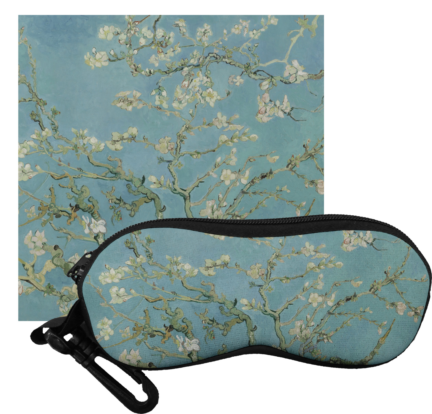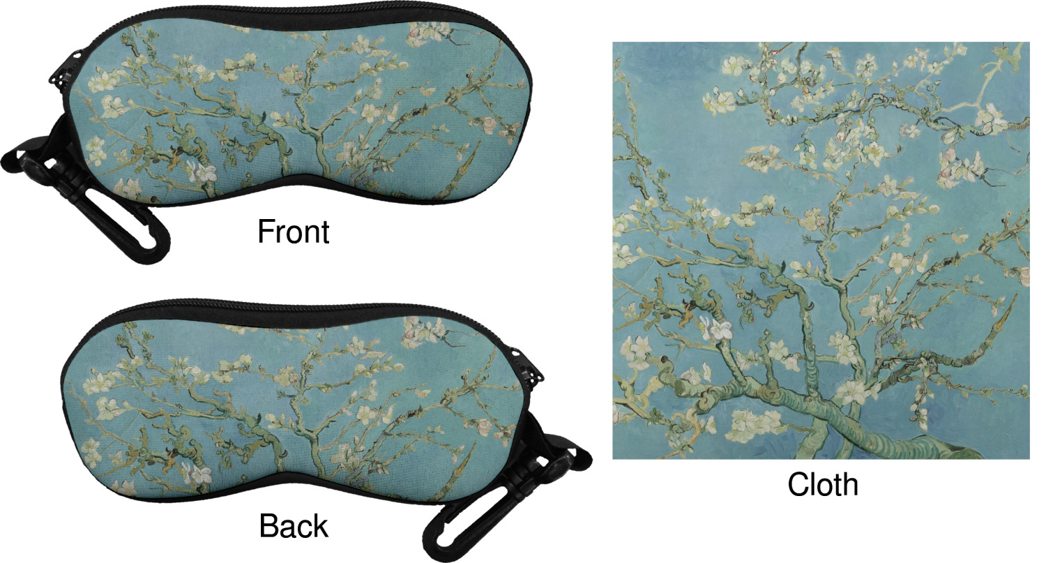 The cases have the design on both sides, a black zipper, and clips for hanging on a belt buckle or purse strap and also include matching lens cloths.