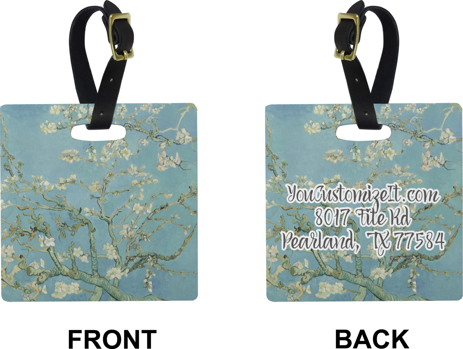 These personalized bag tags are sold in a variety of shapes, so that you may find the product that meets your vision exactly. We sell a round luggage tag, which measures at approximately 4" x 4". Our square luggage tag is about 3.5" x 3.5", while our rectangular version is 2.75" x 4 ".