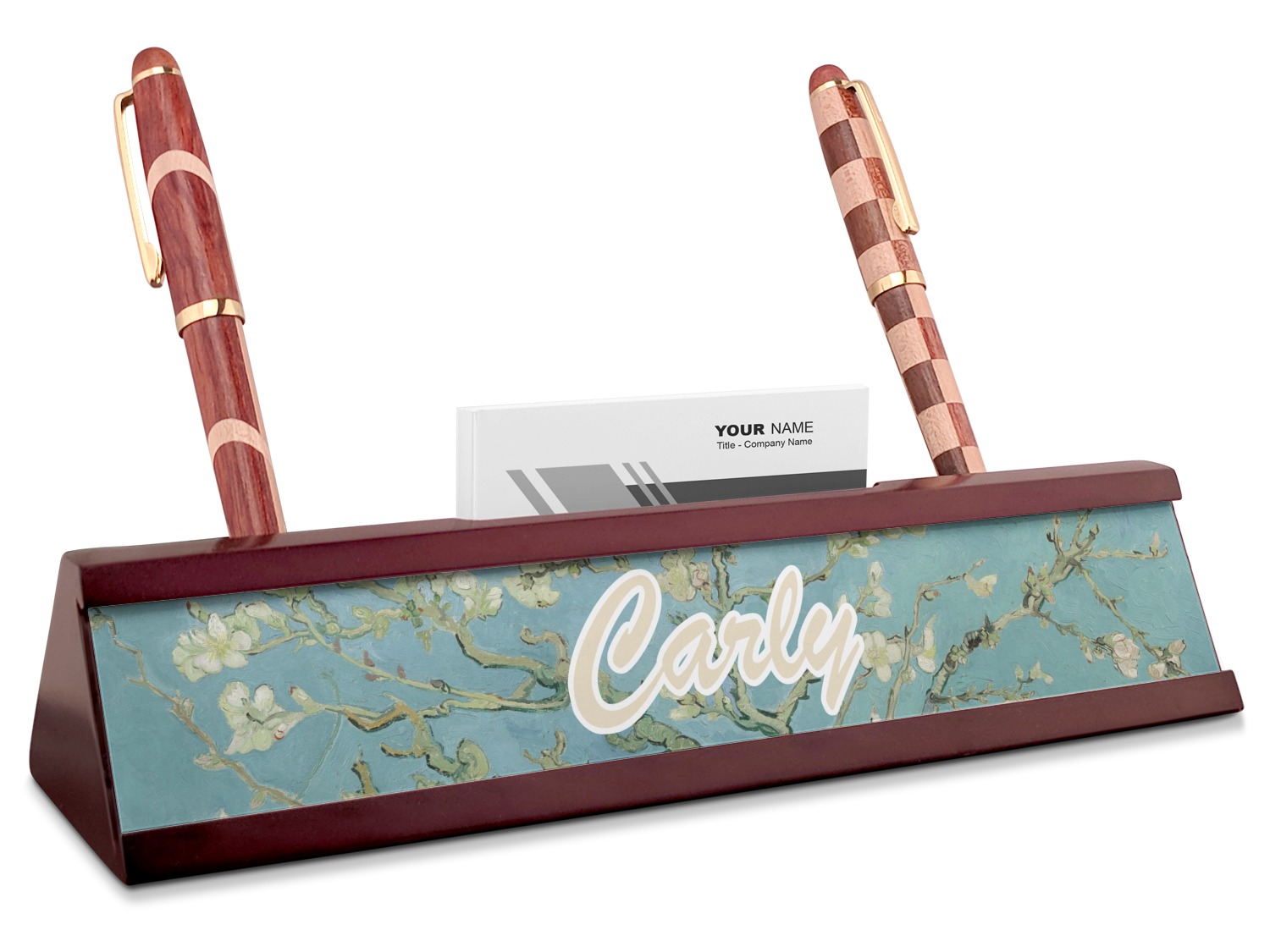 Your desk name plates are crafted from a high-quality, dark-cherry mahogany. At approximately 9.5 by 1.875 by 2.5 inches, this name plaque will fit perfectly, front and center, on your desk. Your customization spans across the entire face of the nameplate. Behind the nameplate lies a skinny slot that can fit approximately 15, traditionally-sized, business cards. You can also store your writing utensils on either side of this custom desk name plate.