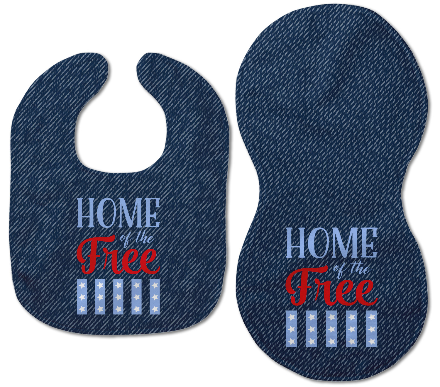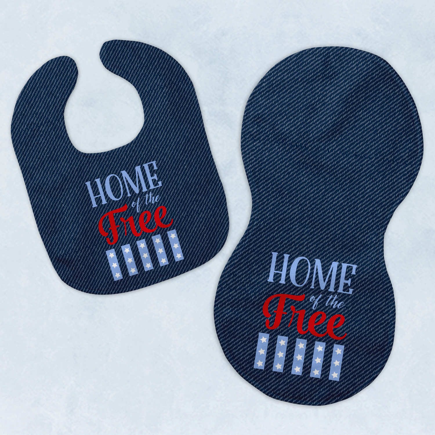 The background of this design is a dark blue denim, while the colors of the quote include a bright red, light blue, and white. The quote itself says "Home of the Free." On the coordinating design a red, white, and blue star is used with the the phrase "Land of the Brave" written underneath.