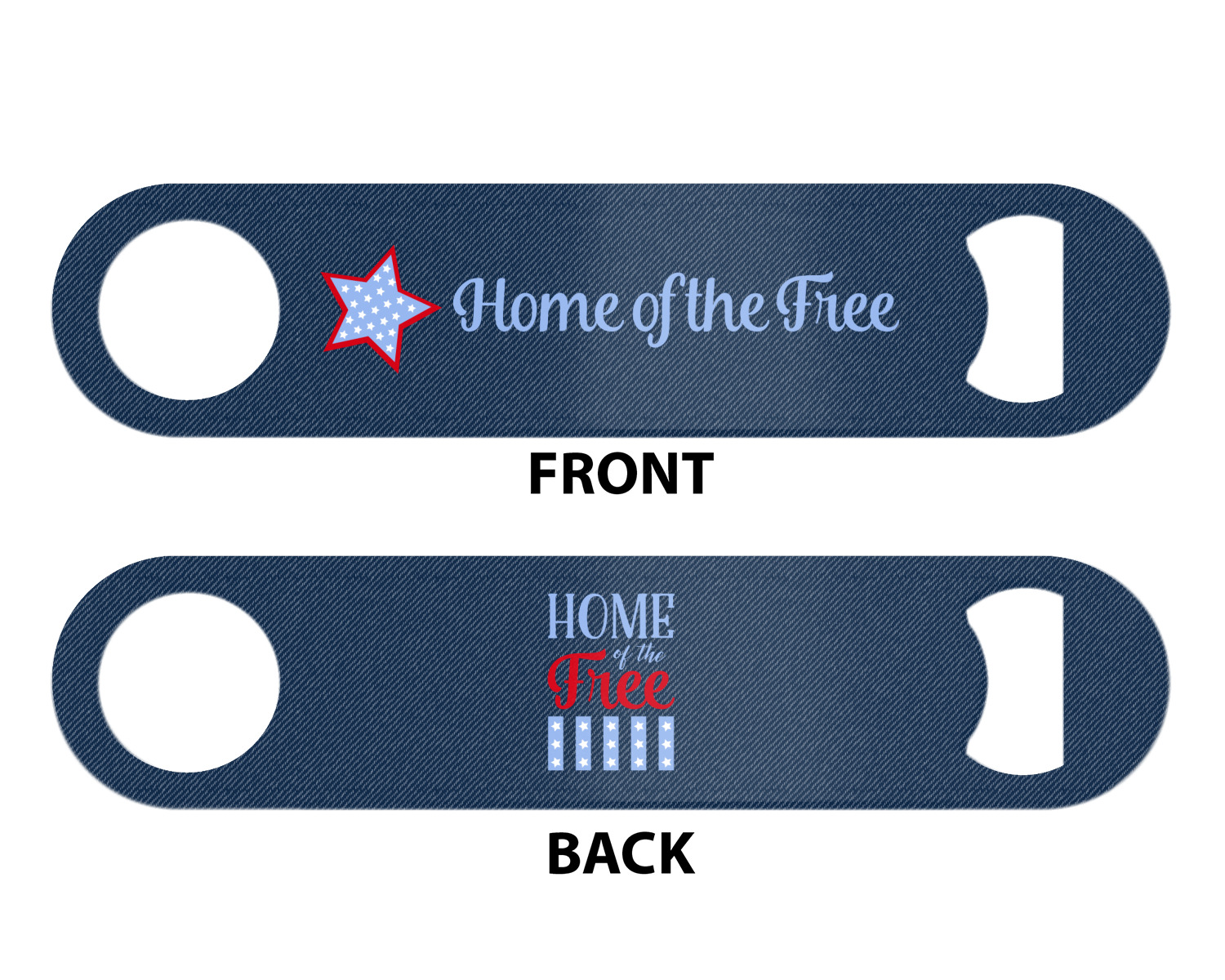 The background of this design is a dark blue denim, while the colors of the quote include a bright red, light blue, and white. The quote itself says "Home of the Free." On the coordinating design a red, white, and blue star is used with the the phrase "Land of the Brave" written underneath.