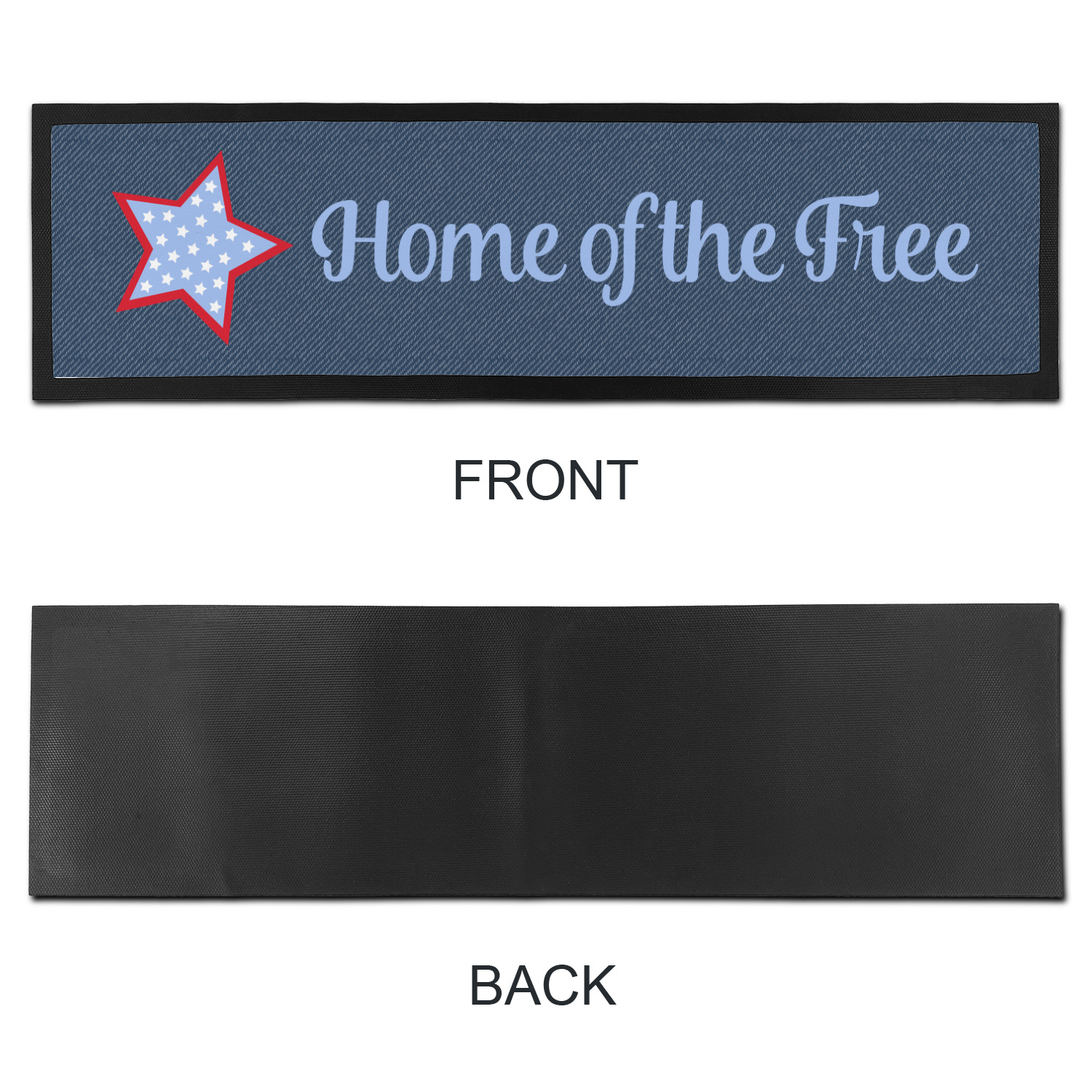 The background of this design is a dark blue denim, while the colors of the quote include a bright red, light blue, and white. The quote itself says "Home of the Free." On the coordinating design a red, white, and blue star is used with the the phrase "Land of the Brave" written underneath.