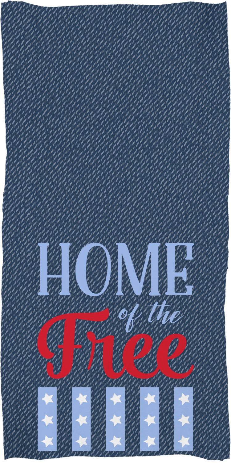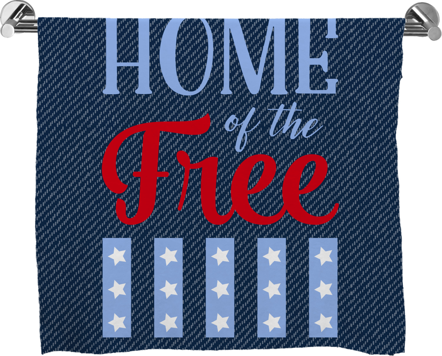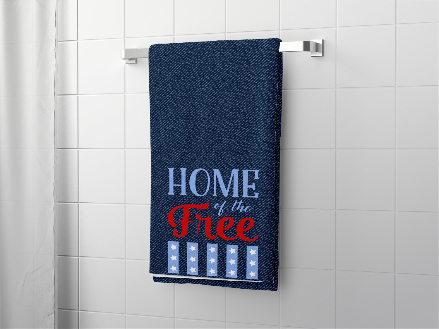 The background of this design is a dark blue denim, while the colors of the quote include a bright red, light blue, and white. The quote itself says "Home of the Free." On the coordinating design a red, white, and blue star is used with the the phrase "Land of the Brave" written underneath.