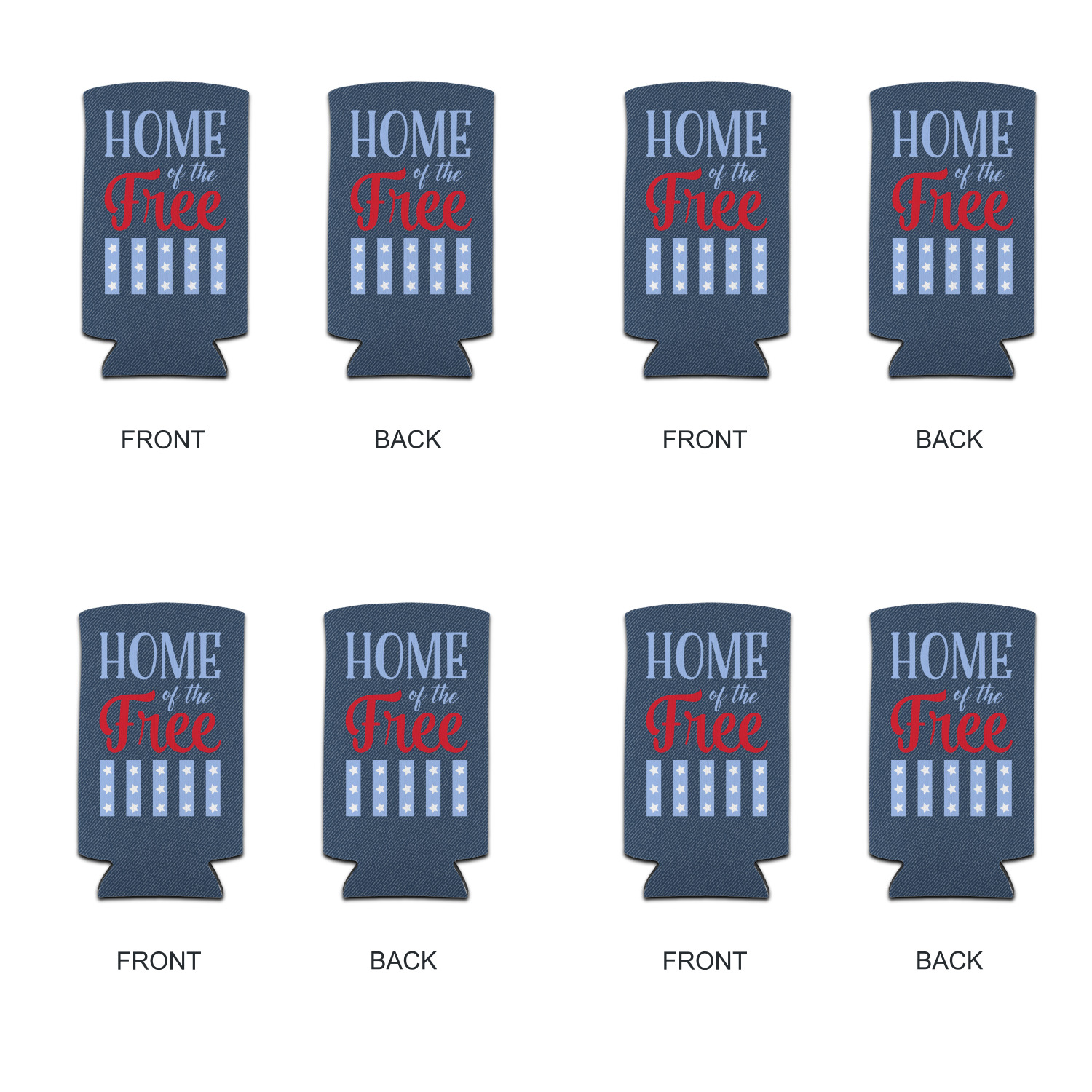 The background of this design is a dark blue denim, while the colors of the quote include a bright red, light blue, and white. The quote itself says "Home of the Free." On the coordinating design a red, white, and blue star is used with the the phrase "Land of the Brave" written underneath.