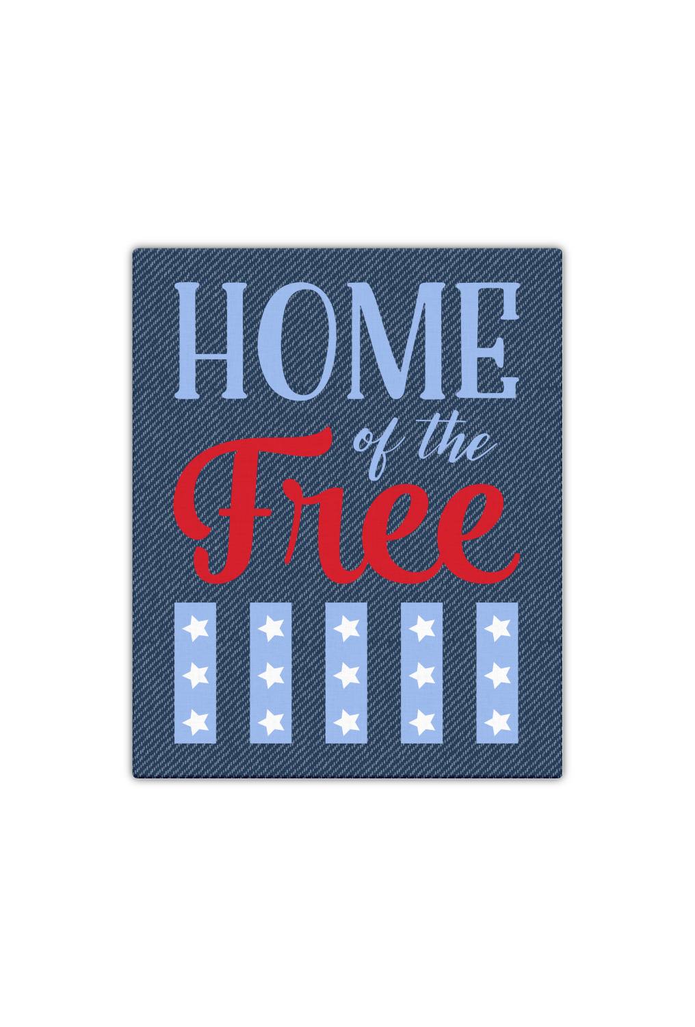The background of this design is a dark blue denim, while the colors of the quote include a bright red, light blue, and white. The quote itself says "Home of the Free." On the coordinating design a red, white, and blue star is used with the the phrase "Land of the Brave" written underneath.