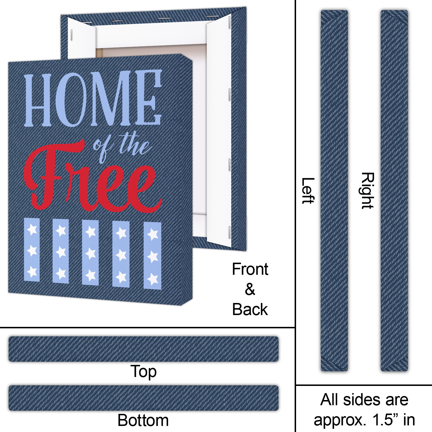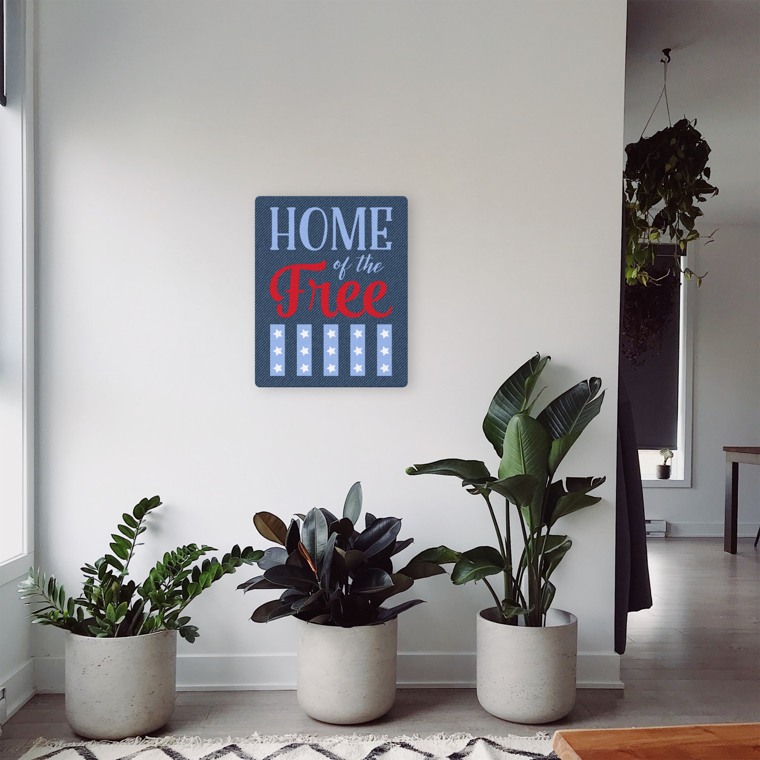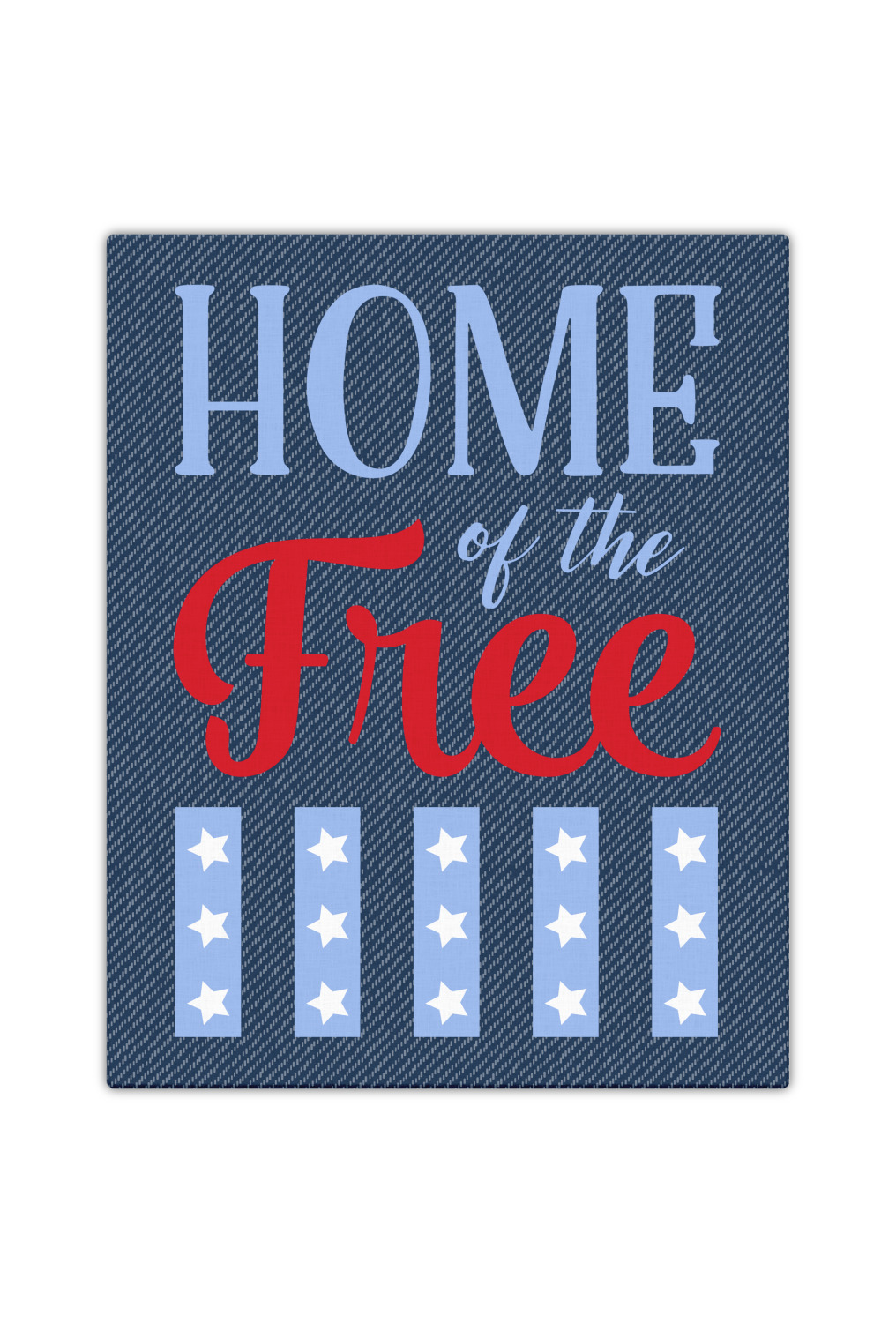 The background of this design is a dark blue denim, while the colors of the quote include a bright red, light blue, and white. The quote itself says "Home of the Free." On the coordinating design a red, white, and blue star is used with the the phrase "Land of the Brave" written underneath.