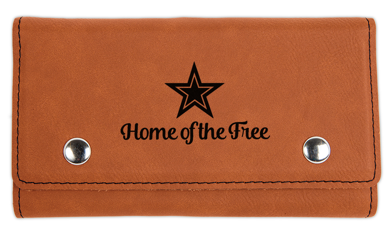 The background of this design is a dark blue denim, while the colors of the quote include a bright red, light blue, and white. The quote itself says "Home of the Free." On the coordinating design a red, white, and blue star is used with the the phrase "Land of the Brave" written underneath.