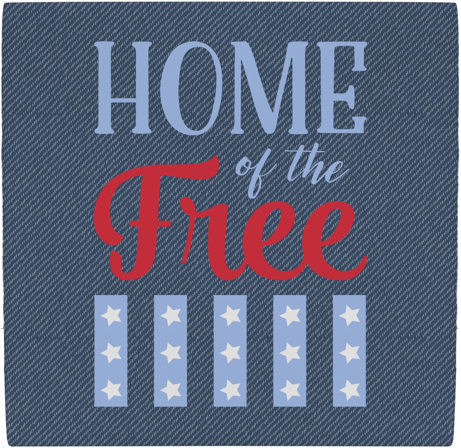 The background of this design is a dark blue denim, while the colors of the quote include a bright red, light blue, and white. The quote itself says "Home of the Free." On the coordinating design a red, white, and blue star is used with the the phrase "Land of the Brave" written underneath.