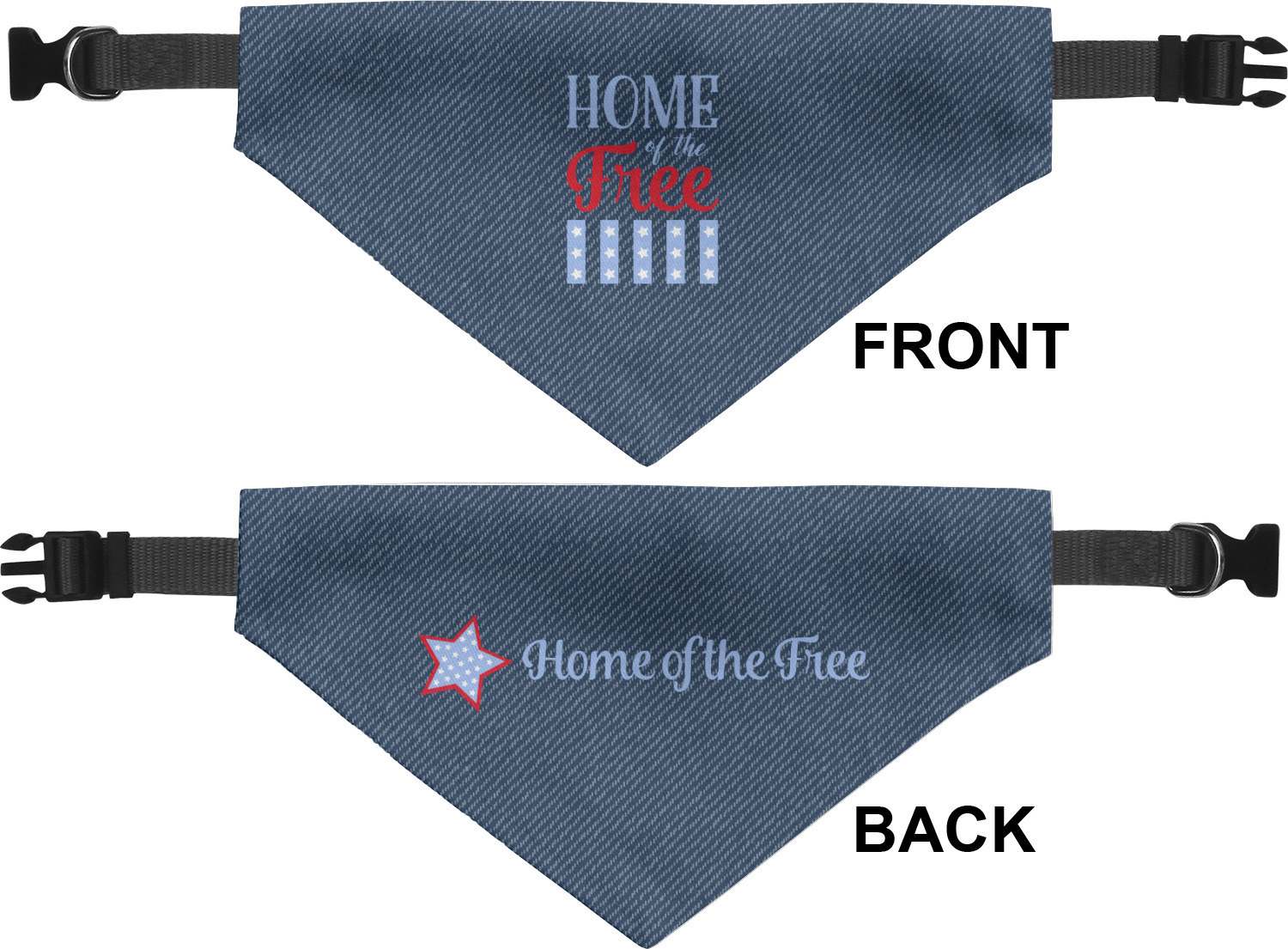 We print the front and back of these dog bandanas with your customized design. The bandana itself is made from a durable polyester, sewn together with a gap large enough to accommodate any collar. Regardless, the bandana includes a plain black, canvas collar with plastic snaps, that can easily be removed if desired. These dog bandana collars are available in four sizes: small, medium, large, and extra large. Please see our sizing chart for more information regarding the dimensions of each size.