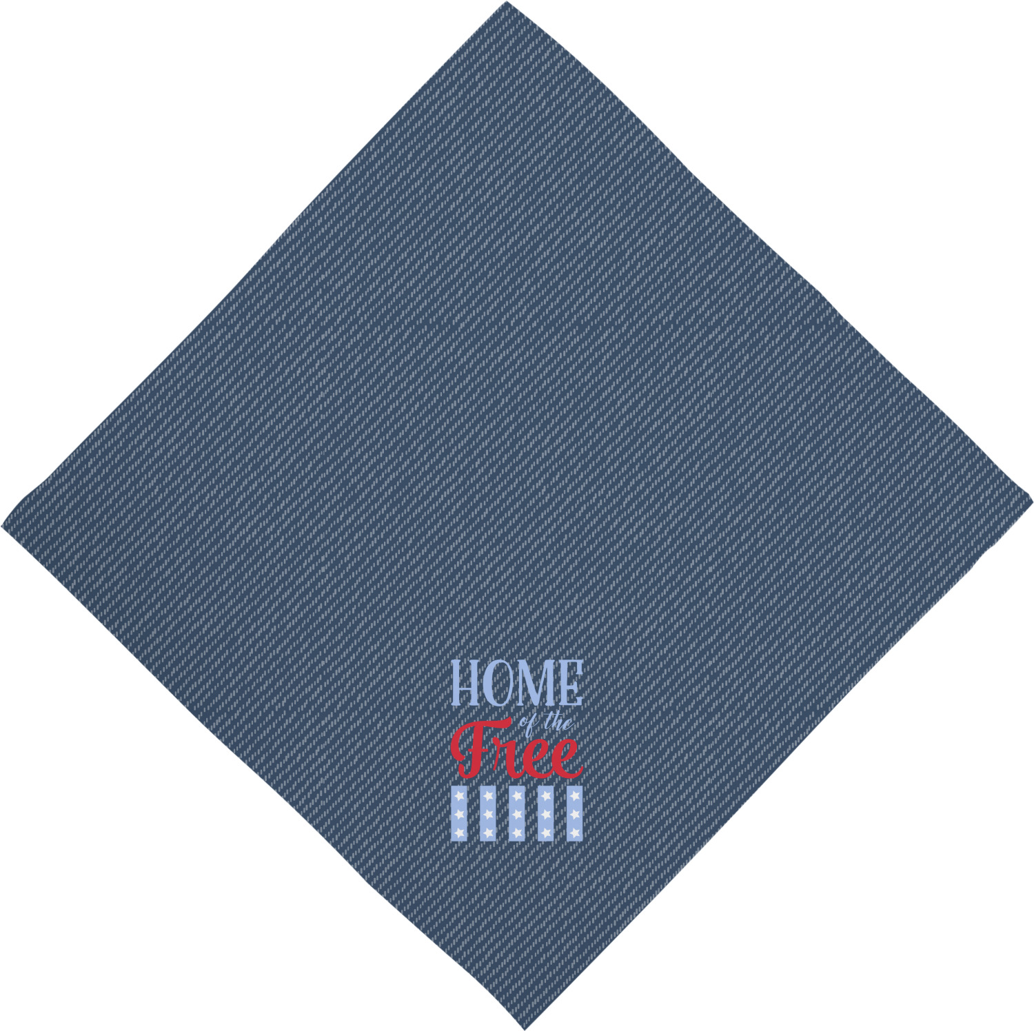 The background of this design is a dark blue denim, while the colors of the quote include a bright red, light blue, and white. The quote itself says "Home of the Free." On the coordinating design a red, white, and blue star is used with the the phrase "Land of the Brave" written underneath.