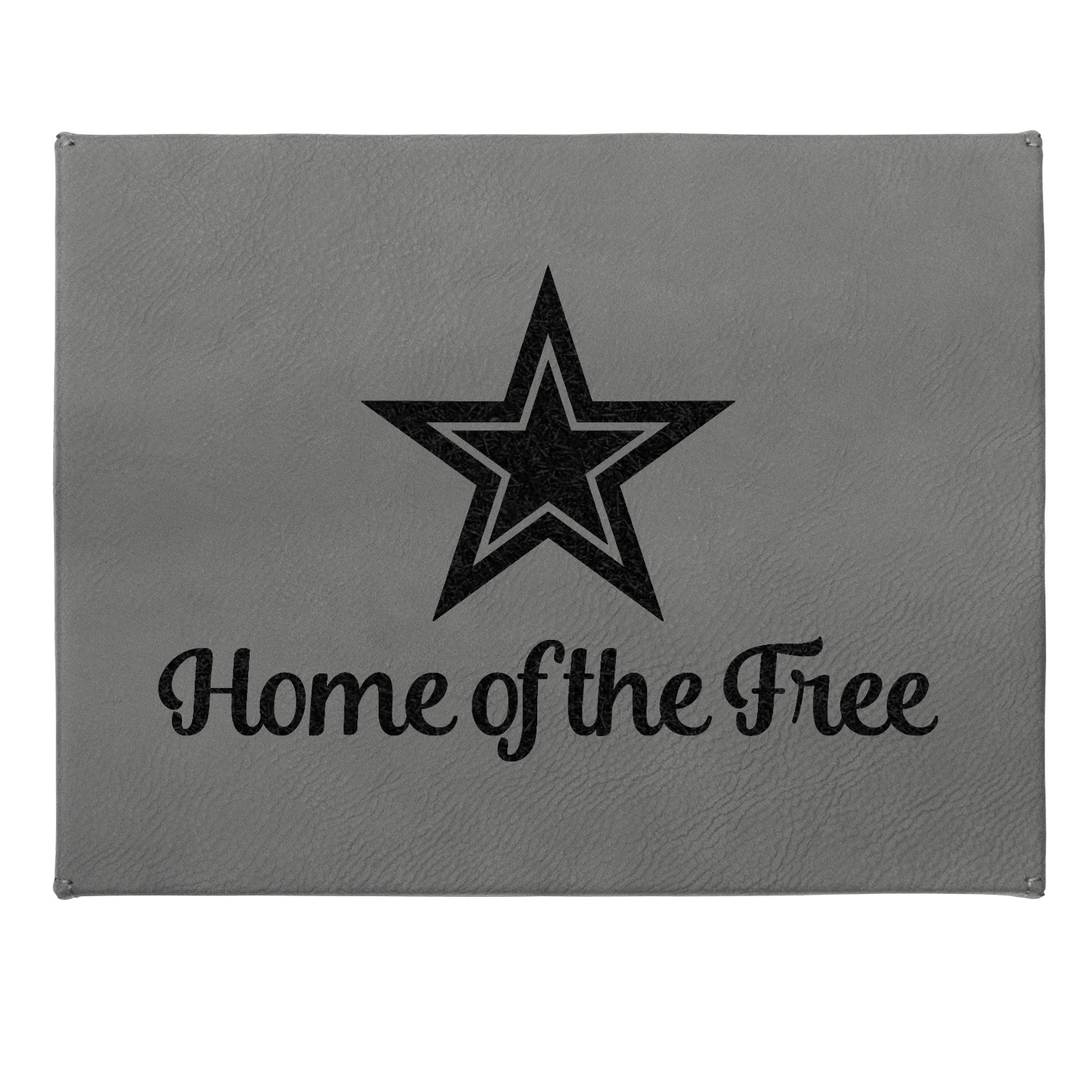The background of this design is a dark blue denim, while the colors of the quote include a bright red, light blue, and white. The quote itself says "Home of the Free." On the coordinating design a red, white, and blue star is used with the the phrase "Land of the Brave" written underneath.