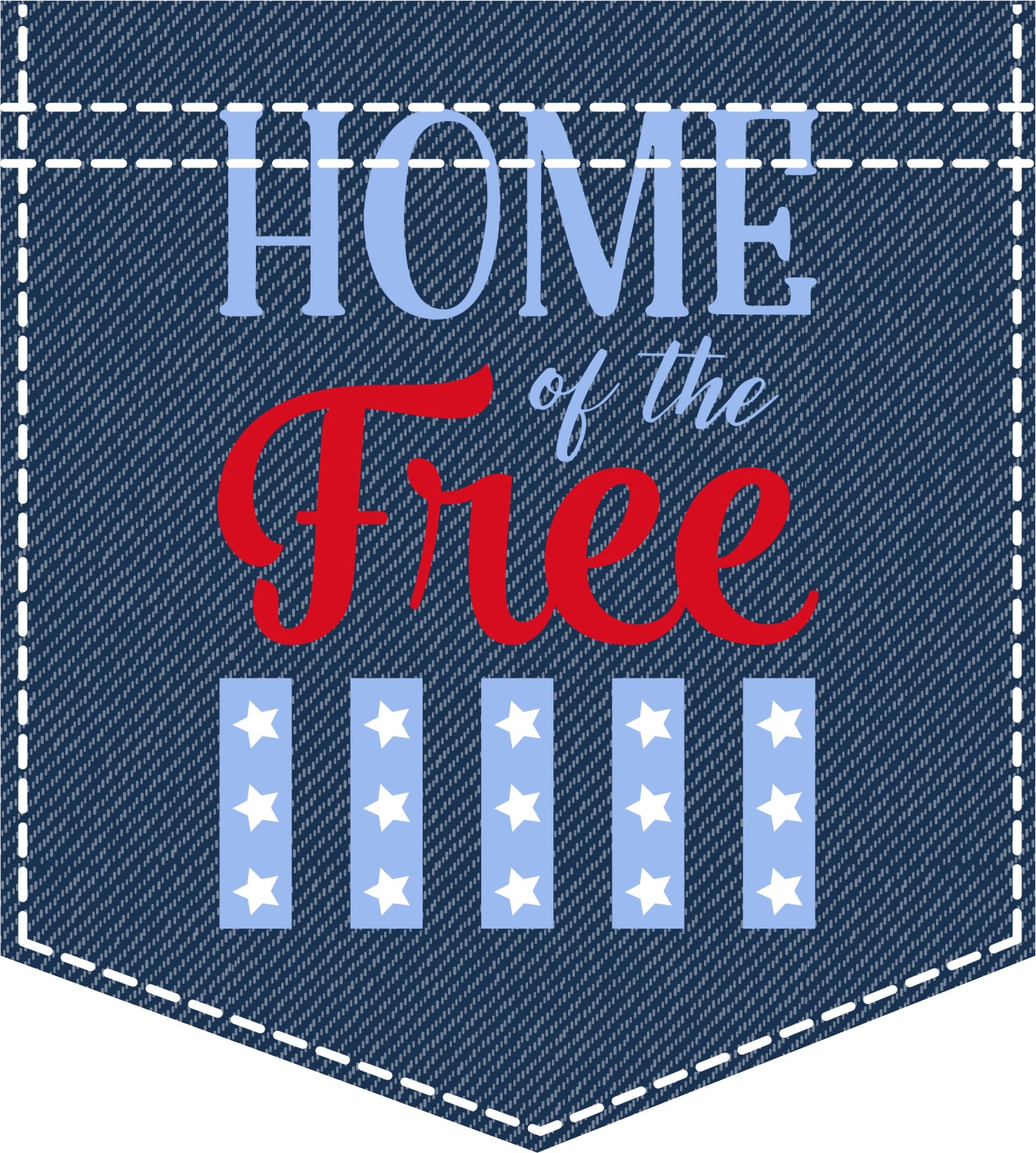 The background of this design is a dark blue denim, while the colors of the quote include a bright red, light blue, and white. The quote itself says "Home of the Free." On the coordinating design a red, white, and blue star is used with the the phrase "Land of the Brave" written underneath.
