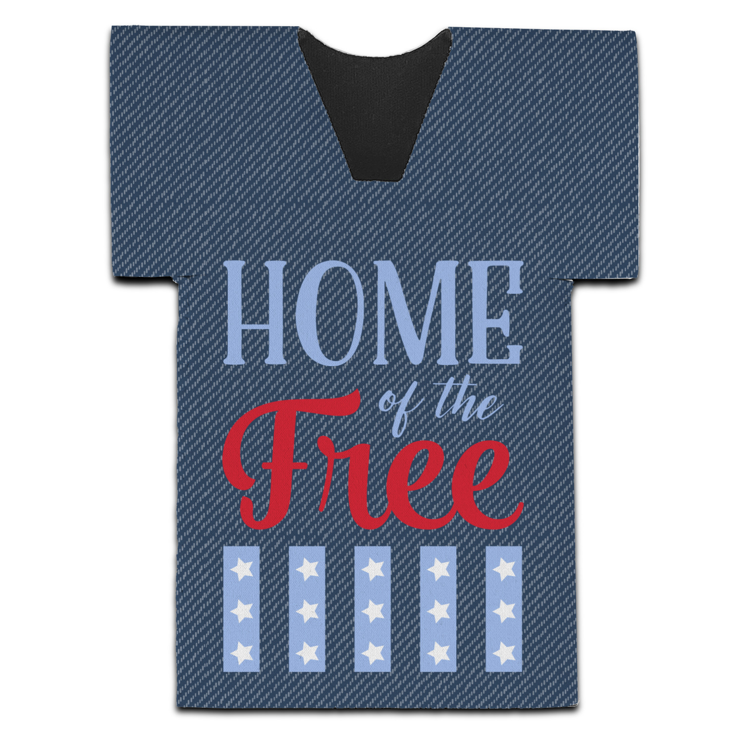 The background of this design is a dark blue denim, while the colors of the quote include a bright red, light blue, and white. The quote itself says "Home of the Free." On the coordinating design a red, white, and blue star is used with the the phrase "Land of the Brave" written underneath.