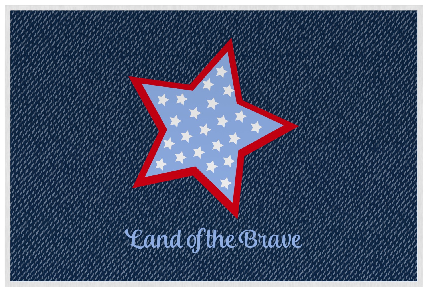 The background of this design is a dark blue denim, while the colors of the quote include a bright red, light blue, and white. The quote itself says "Home of the Free." On the coordinating design a red, white, and blue star is used with the the phrase "Land of the Brave" written underneath.