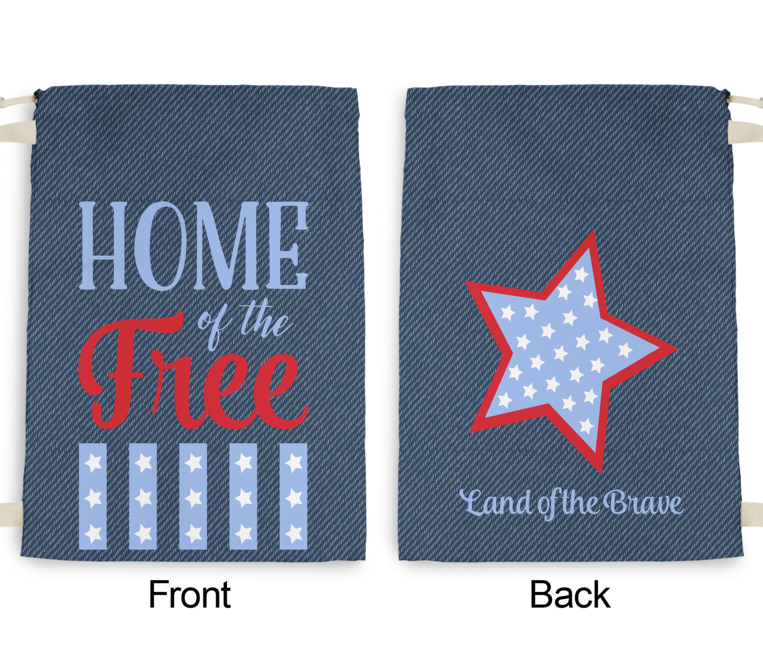 The background of this design is a dark blue denim, while the colors of the quote include a bright red, light blue, and white. The quote itself says "Home of the Free." On the coordinating design a red, white, and blue star is used with the the phrase "Land of the Brave" written underneath.