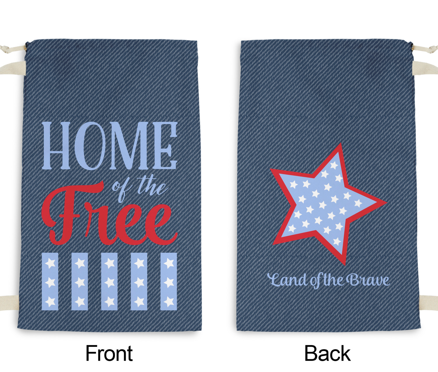 The background of this design is a dark blue denim, while the colors of the quote include a bright red, light blue, and white. The quote itself says "Home of the Free." On the coordinating design a red, white, and blue star is used with the the phrase "Land of the Brave" written underneath.
