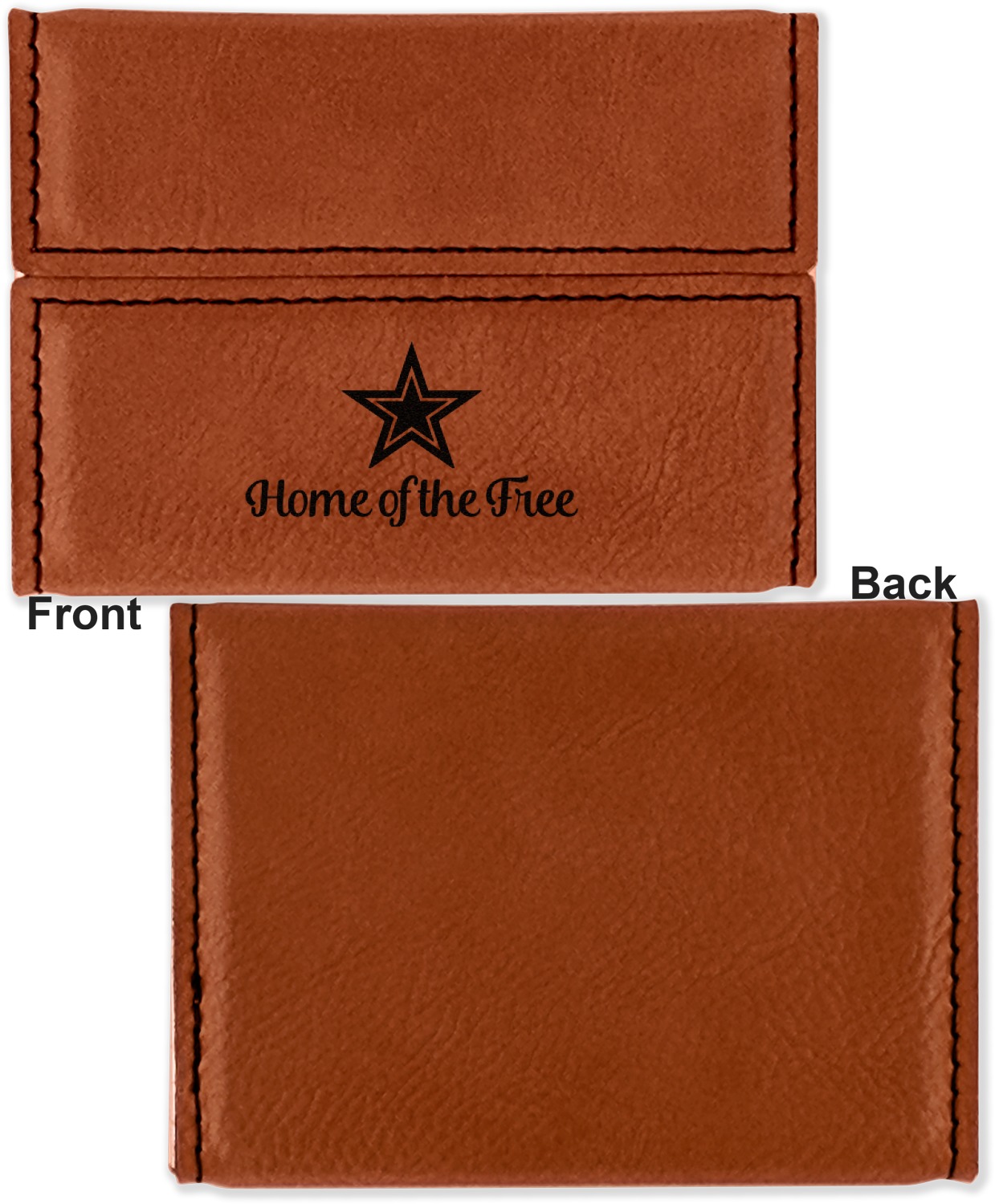 Your personalized design is laser engraved onto either the front, or the front and back of the card holder, depending on the model you purchase. Once engraved, the design will appear a darkened black against the cognac color of the leatherette.