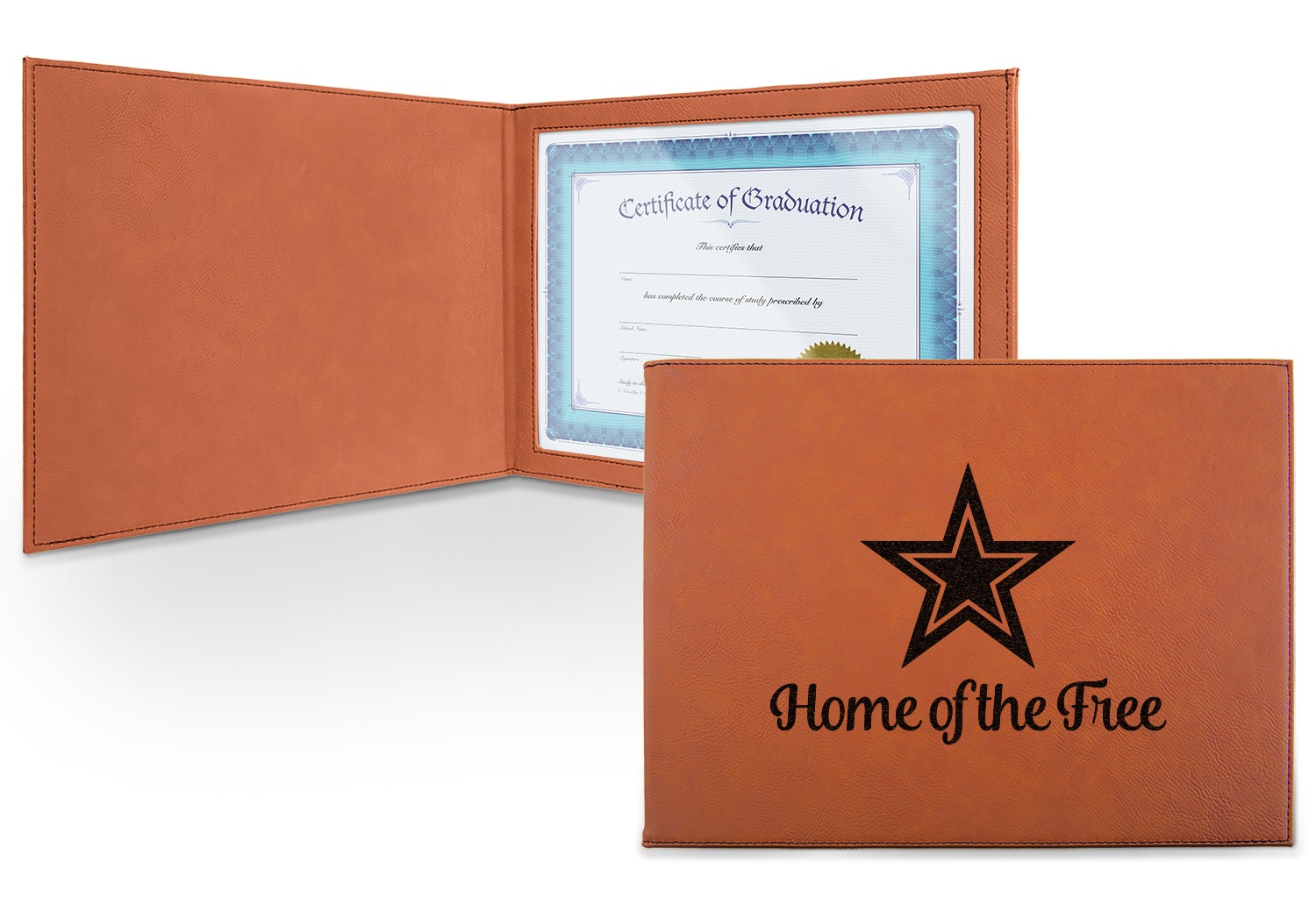 This cognac-colored, leatherette certificate jacket is the ideal way to display or store your hard-earned certificate. When closed, the custom certificate holder measures at 12 by 9 inches. The interior of the certificate cover includes a clear, vinyl window to encase your diploma. The window measures at around 10.5 by 7.5 inches and can accommodate a diploma that measures at up to 8.5 by 11 inches. You can either choose to have your customization laser engraved on the front and interior, or solely the front.