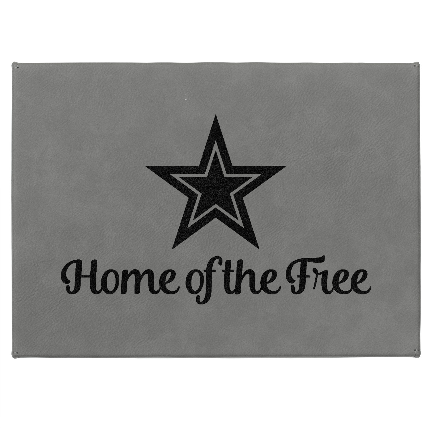 The background of this design is a dark blue denim, while the colors of the quote include a bright red, light blue, and white. The quote itself says "Home of the Free." On the coordinating design a red, white, and blue star is used with the the phrase "Land of the Brave" written underneath.