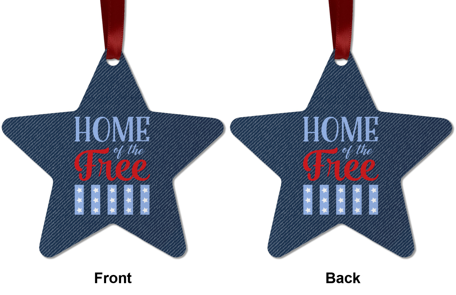The background of this design is a dark blue denim, while the colors of the quote include a bright red, light blue, and white. The quote itself says "Home of the Free." On the coordinating design a red, white, and blue star is used with the the phrase "Land of the Brave" written underneath.