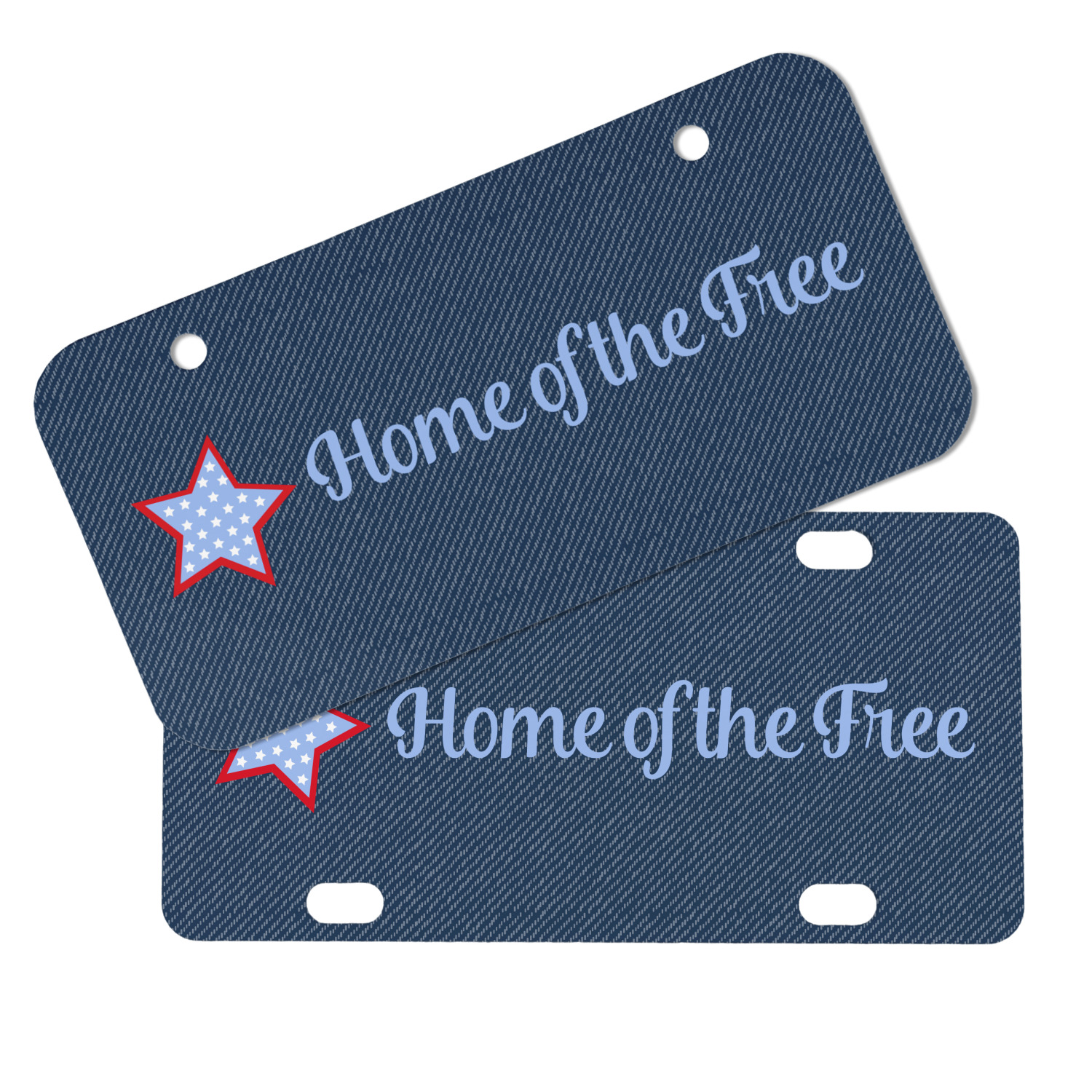 The background of this design is a dark blue denim, while the colors of the quote include a bright red, light blue, and white. The quote itself says "Home of the Free." On the coordinating design a red, white, and blue star is used with the the phrase "Land of the Brave" written underneath.