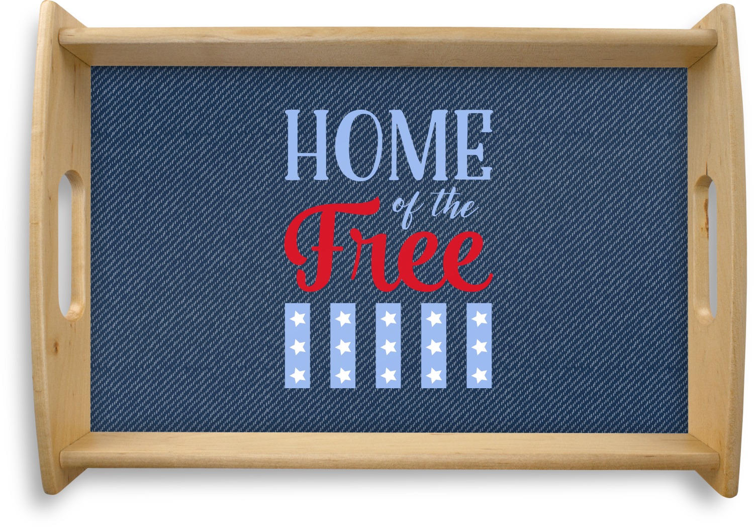 This serving tray with handles features square edges and two rounded sides, creating a very modern look. Each side is fabricated from a beautifully cut, natural wood. The bottom of the interior of the tray displays your customized design in bright, vibrant color. The tray is sold in both a black color and a natural wood look. Each variation of the wood serving tray has two sizes: Small, which is 14" x 10" x 2.25", and Large, which is 19.5" x 13.5" x 2.75".