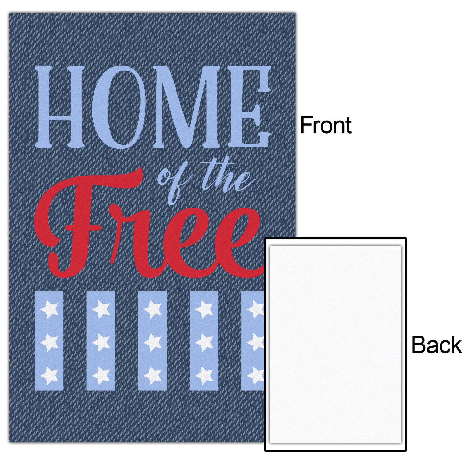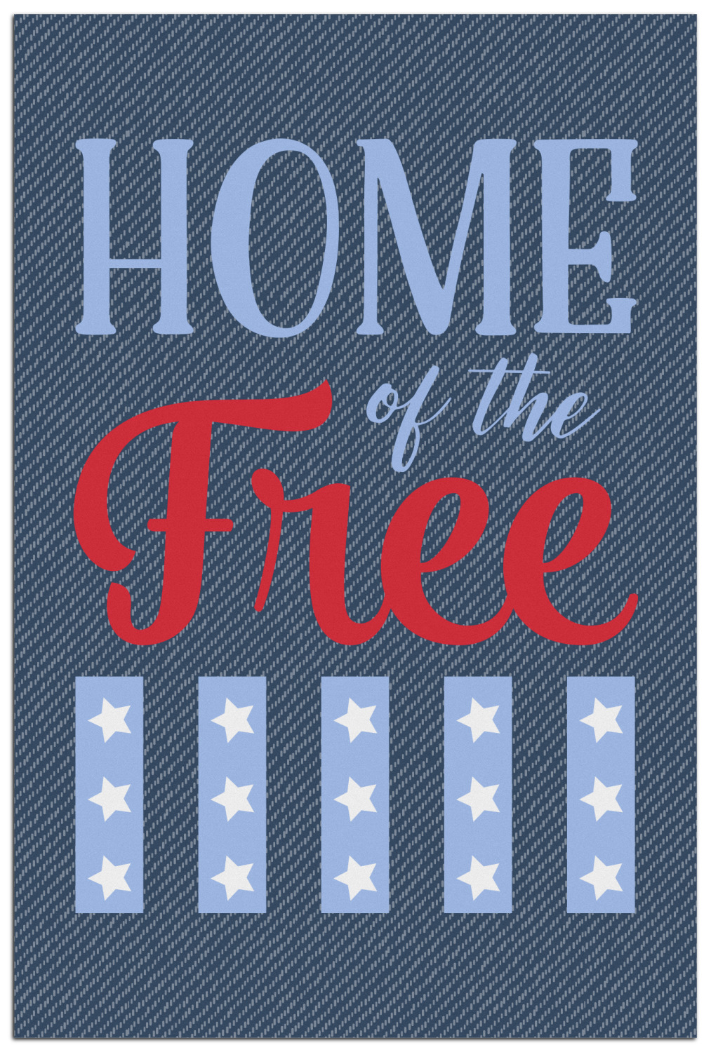 The background of this design is a dark blue denim, while the colors of the quote include a bright red, light blue, and white. The quote itself says "Home of the Free." On the coordinating design a red, white, and blue star is used with the the phrase "Land of the Brave" written underneath.