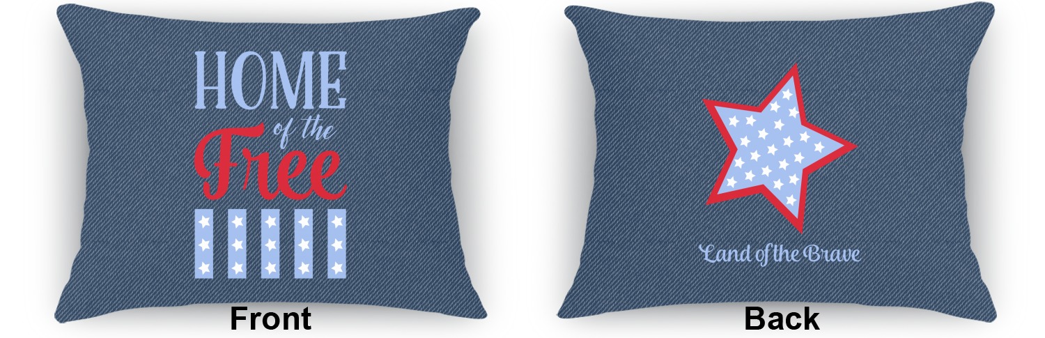 The background of this design is a dark blue denim, while the colors of the quote include a bright red, light blue, and white. The quote itself says "Home of the Free." On the coordinating design a red, white, and blue star is used with the the phrase "Land of the Brave" written underneath.
