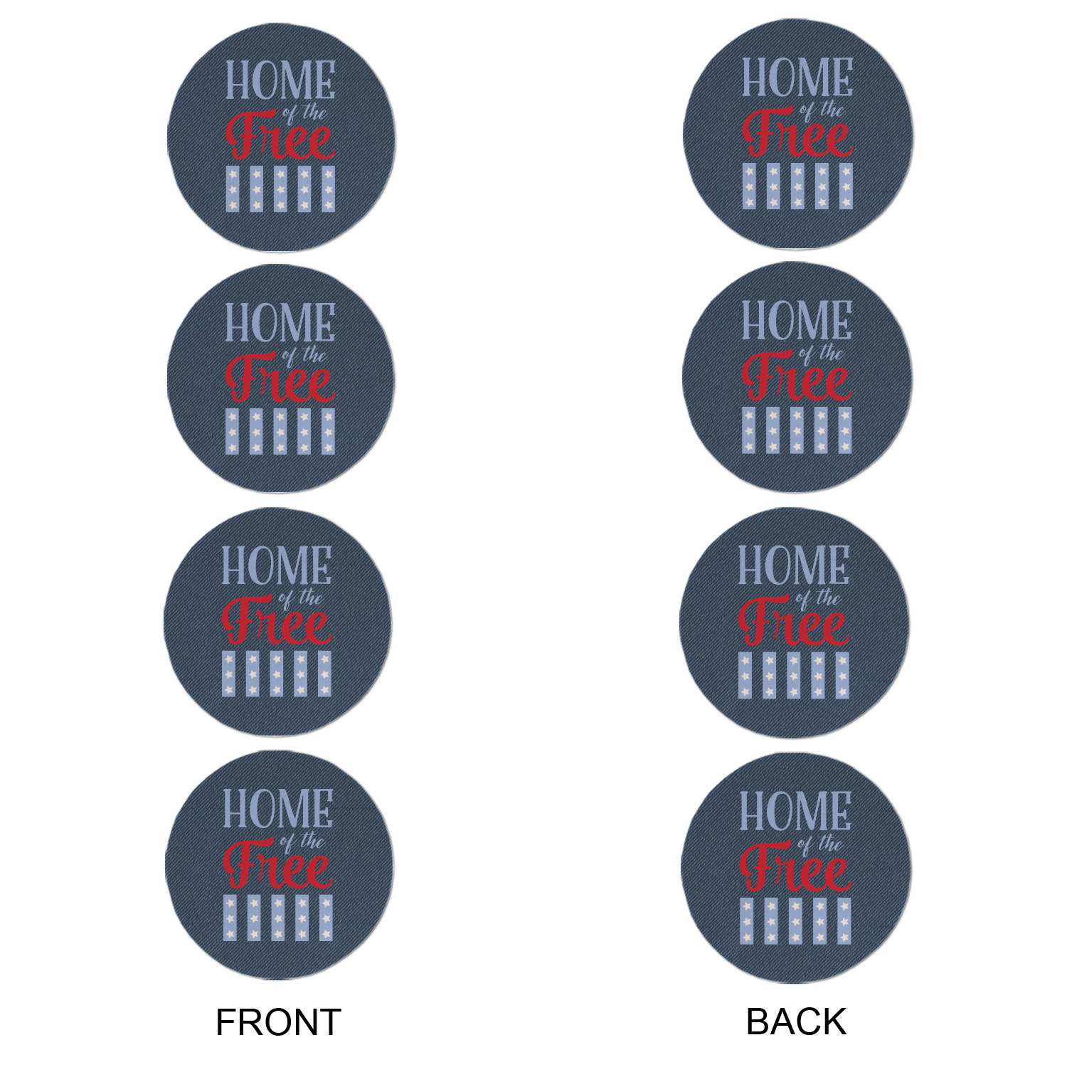 The background of this design is a dark blue denim, while the colors of the quote include a bright red, light blue, and white. The quote itself says "Home of the Free." On the coordinating design a red, white, and blue star is used with the the phrase "Land of the Brave" written underneath.