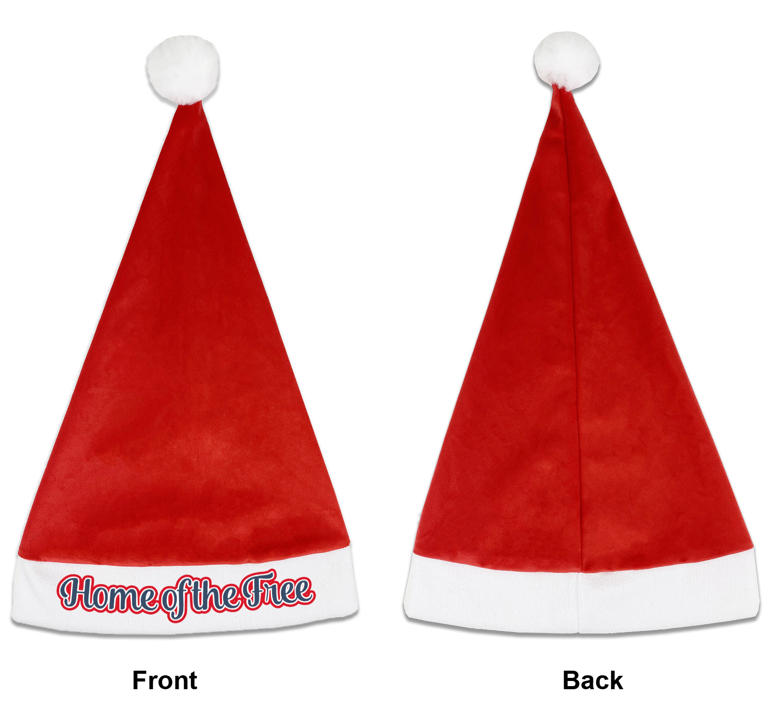 Our Santa hats are a soft, velvety polyester material. These customizable Santa hats are a classic red with white brimming and pom pom ball hanging off the hat tail just like Santa Claus! Each personalized Santa hat is approximately 17.5 L x 11.8 W. We offer two different styles to print your designs on the white brim - front or front & back.