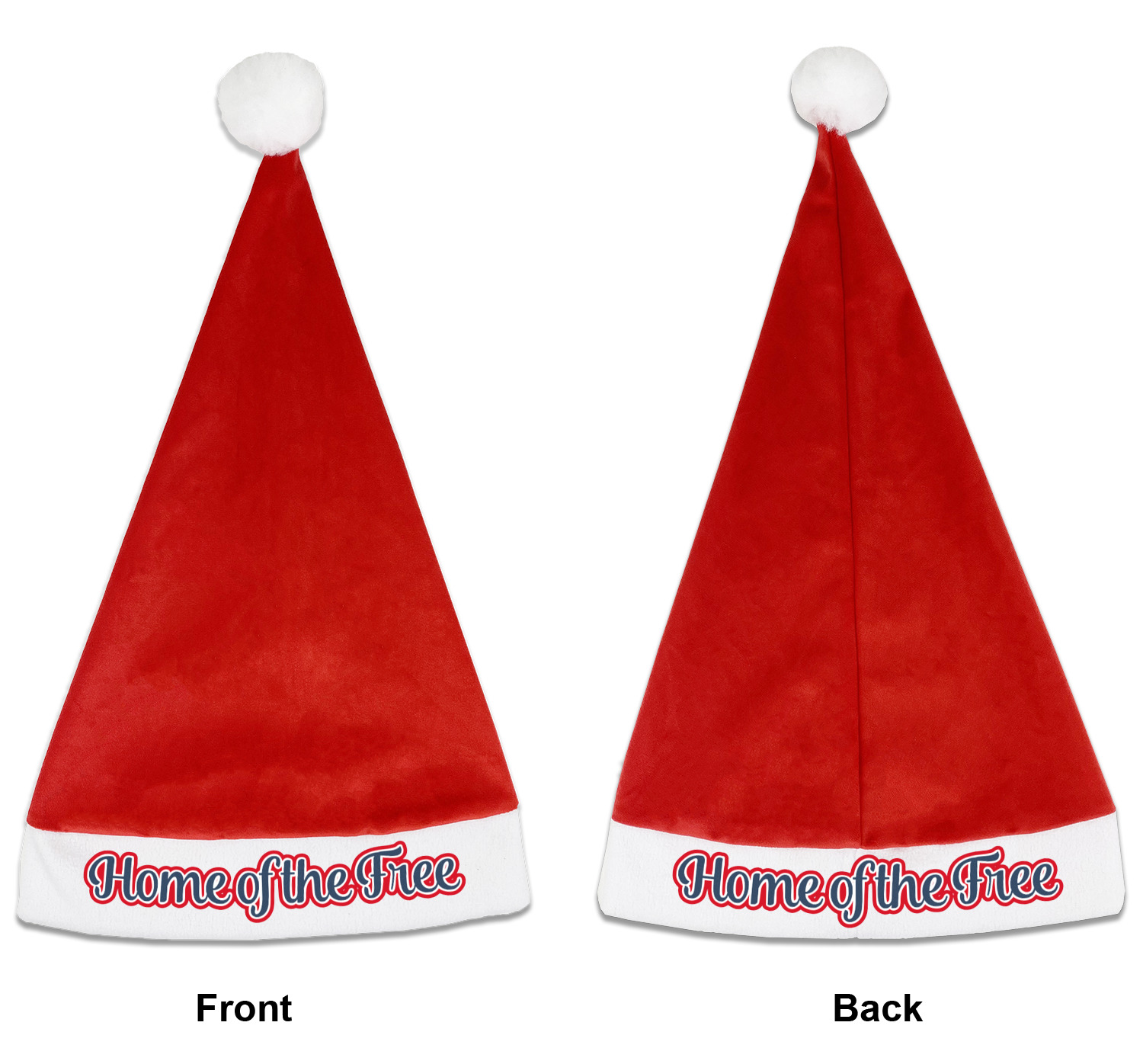 Our Santa hats are a soft, velvety polyester material. These customizable Santa hats are a classic red with white brimming and pom pom ball hanging off the hat tail just like Santa Claus! Each personalized Santa hat is approximately 17.5 L x 11.8 W. We offer two different styles to print your designs on the white brim - front or front & back.