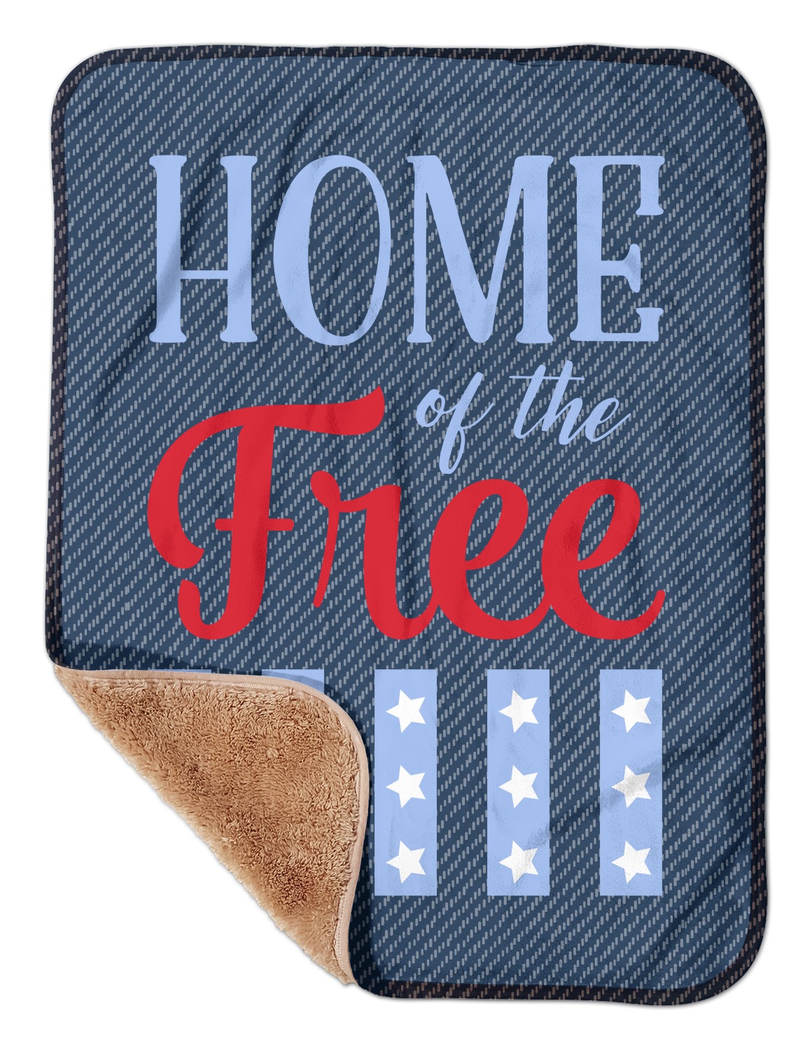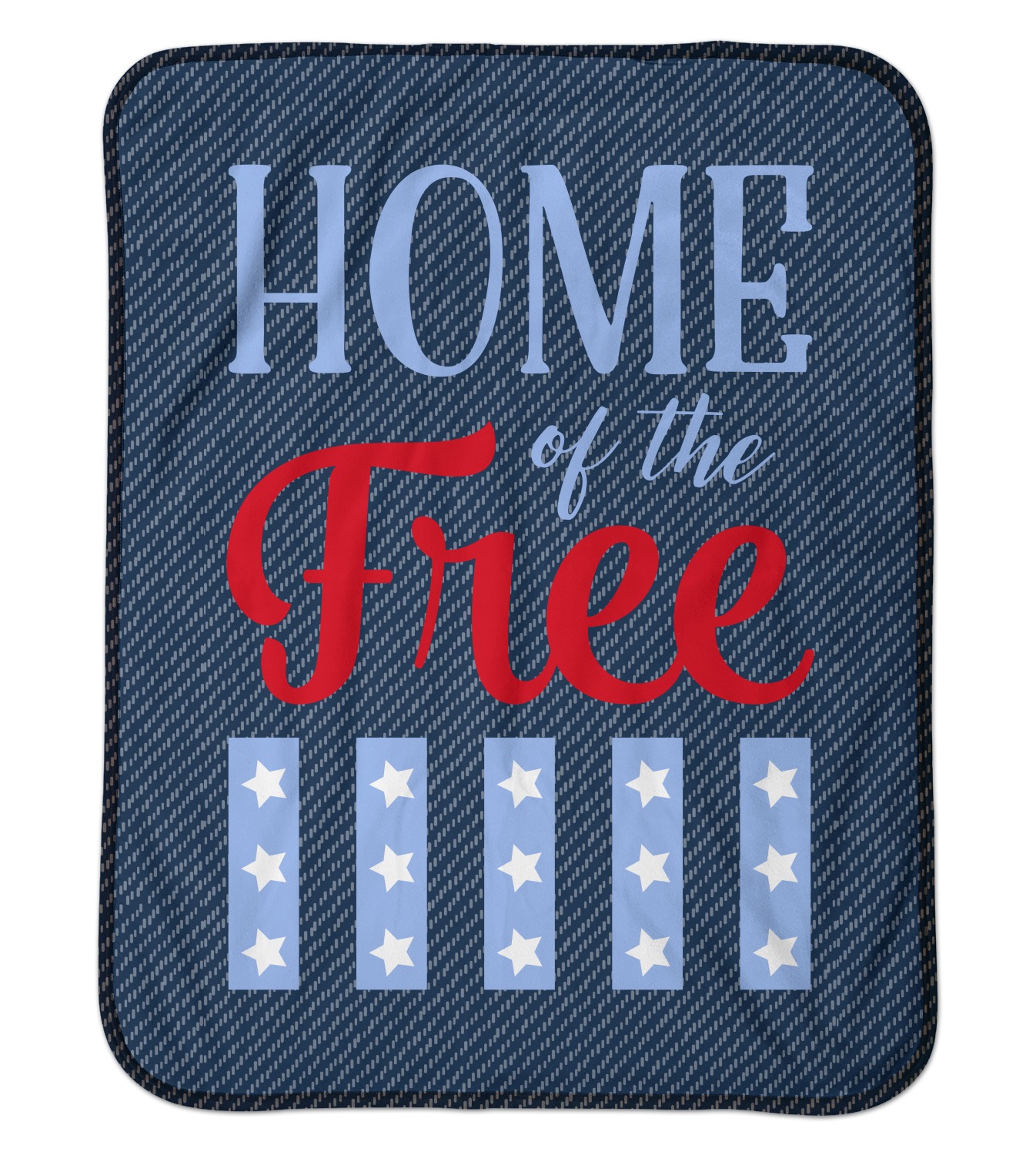 The background of this design is a dark blue denim, while the colors of the quote include a bright red, light blue, and white. The quote itself says "Home of the Free." On the coordinating design a red, white, and blue star is used with the the phrase "Land of the Brave" written underneath.