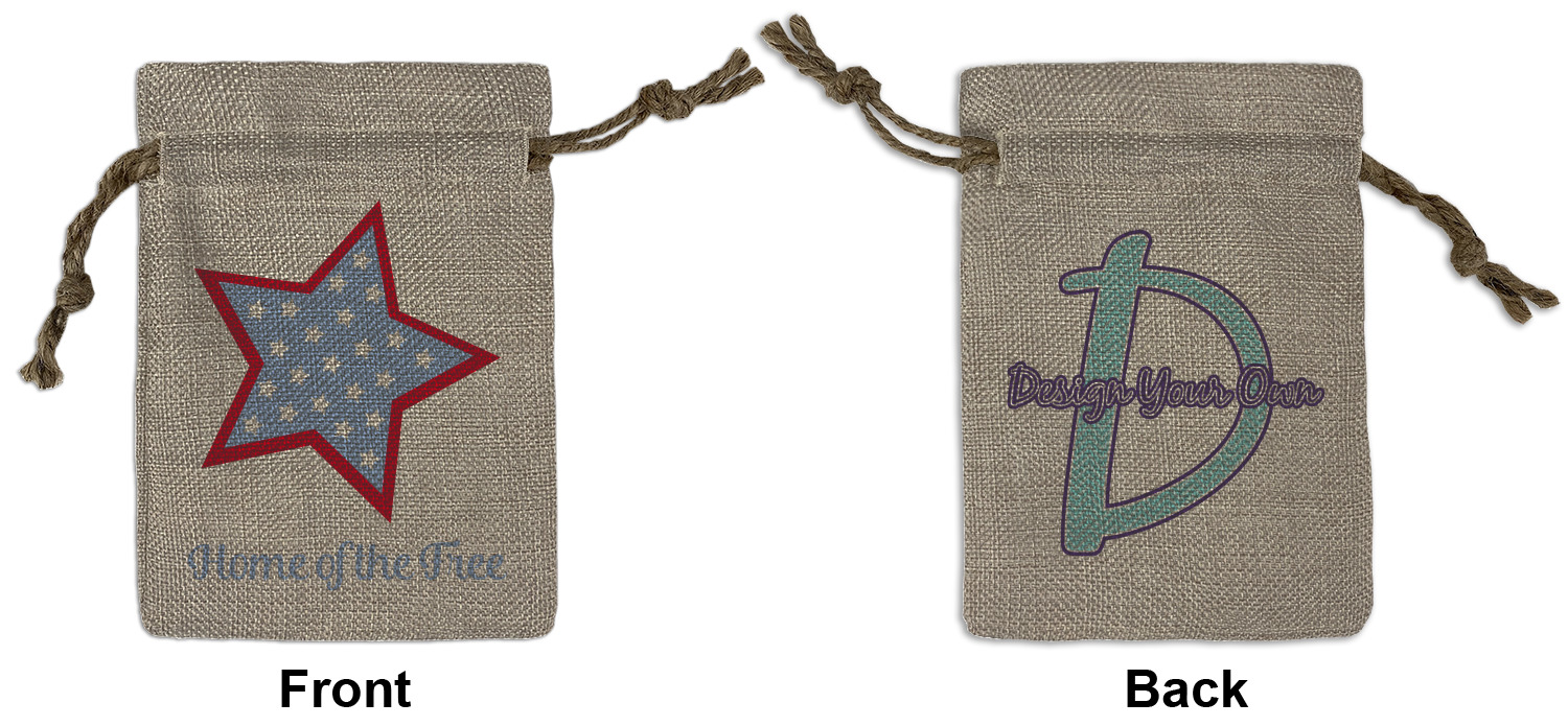 We sell our Burlap Gift Bags in 3 variant sized bags. Made with burlap polyester, each personalized bag can be secured with a twine drawstring pull. Your custom design is available to print on one side or both sides - completely up to you! The sizes of the bags measure approximately 4.5" x 6.5" for the smallest size, 6.5" x 8.0" for the medium size, and 6.5" x 13.5" for the large-sized bag.