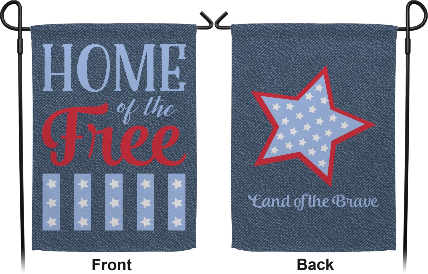 These custom garden flags are made of a durable, double-ply, polyester weave, allowing them to withstand the elements year round. The small flags measure at approximately 12 by 18 inches. The large flags measure out to 28 by 37 inches. You can order these decorative flags with your customization printed on the front only, or the front and back.