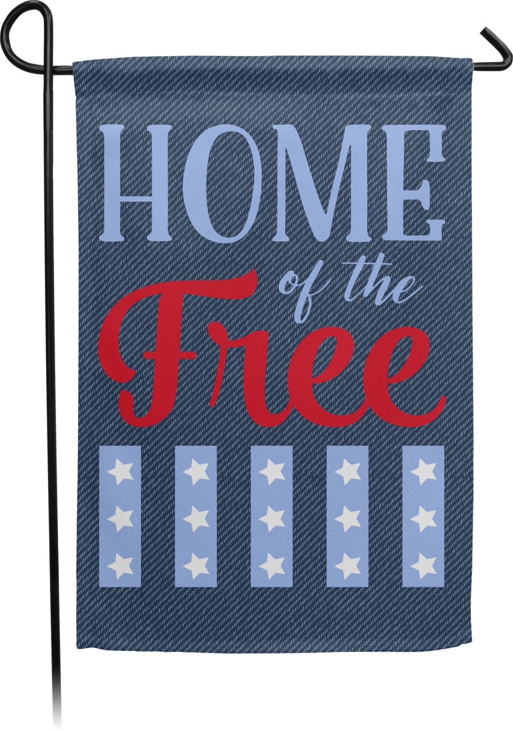 The background of this design is a dark blue denim, while the colors of the quote include a bright red, light blue, and white. The quote itself says "Home of the Free." On the coordinating design a red, white, and blue star is used with the the phrase "Land of the Brave" written underneath.