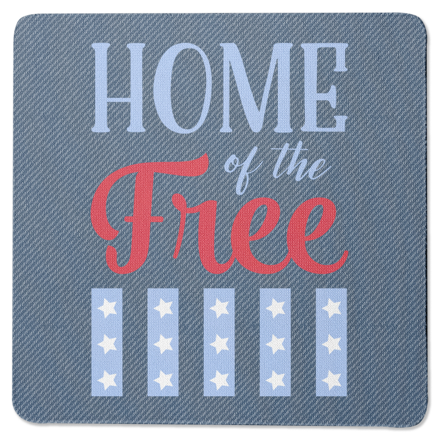 The background of this design is a dark blue denim, while the colors of the quote include a bright red, light blue, and white. The quote itself says "Home of the Free." On the coordinating design a red, white, and blue star is used with the the phrase "Land of the Brave" written underneath.