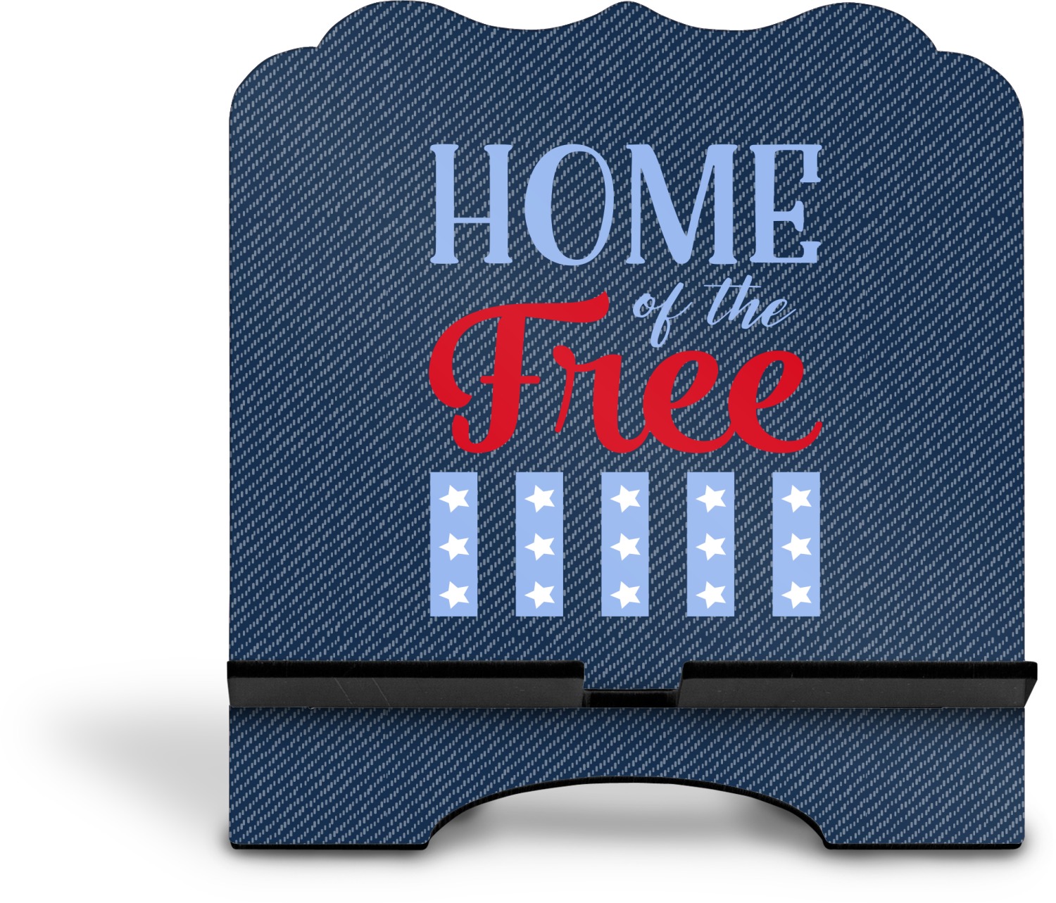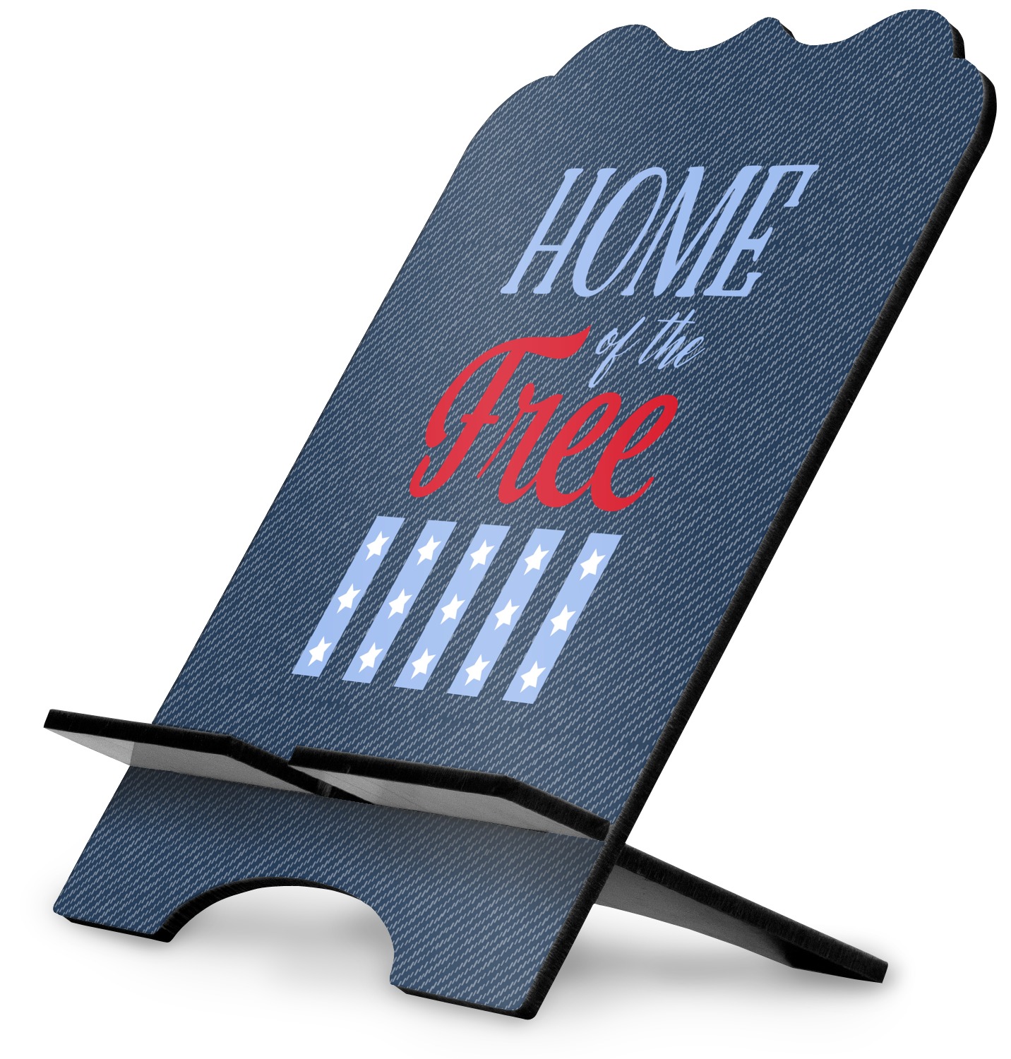 The stand is comprised of two hardboard pieces that fit snugly together and stabilize one another. The bottom part of the iPad stand supports your tablet, and has space for your tablets charger while in use. At 9.25" x 11.5", this tablet mount can support a device between the sizes of the iPad Pro and the iPad Mini 2. The uppermost part of the stand features a decorative, curved edge for a classy, suave appearance. We print your customization atop the face of the stand, in vibrant color. The remaining sides are colored a sleek black.