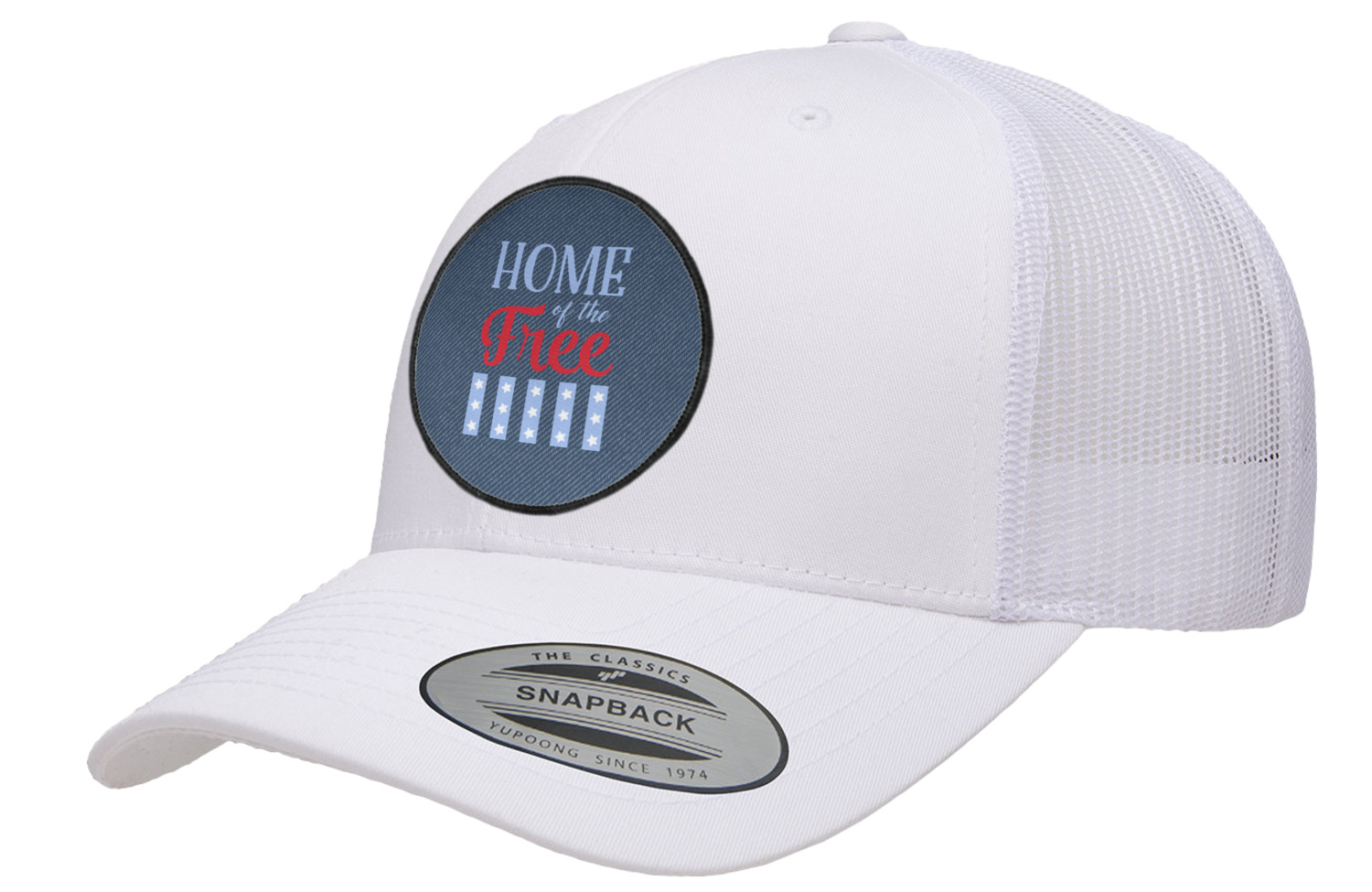 The background of this design is a dark blue denim, while the colors of the quote include a bright red, light blue, and white. The quote itself says "Home of the Free." On the coordinating design a red, white, and blue star is used with the the phrase "Land of the Brave" written underneath.