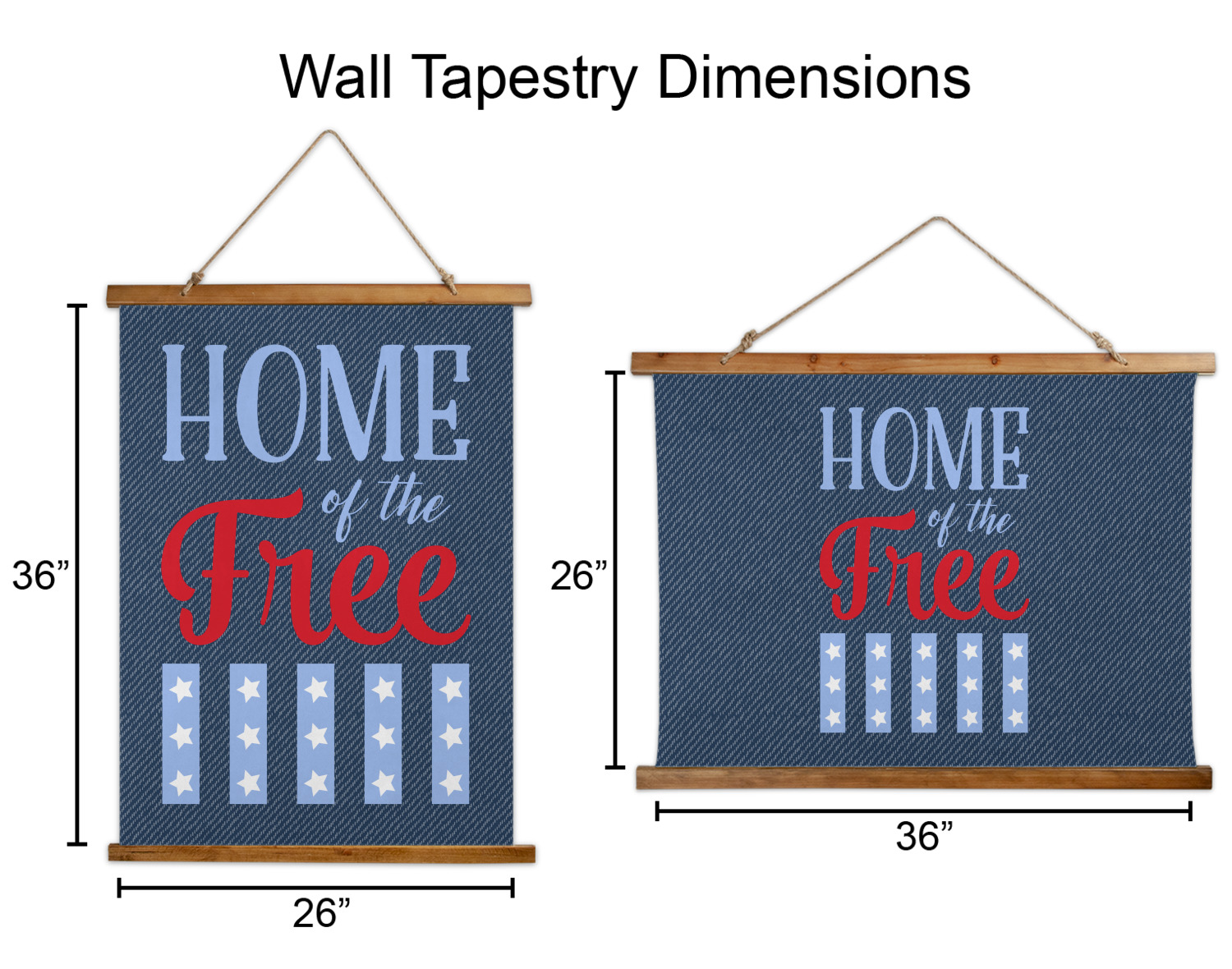 Made in two different orientations - portrait or landscape - both are 26" x 36". Your design is printed on a high quality polyester fabric with hemmed edges. The wood on the top and bottom of the tapestry is 1.25" tall and 0.25" thick and there are two pieces on top and bottom which sandwich the fabric.