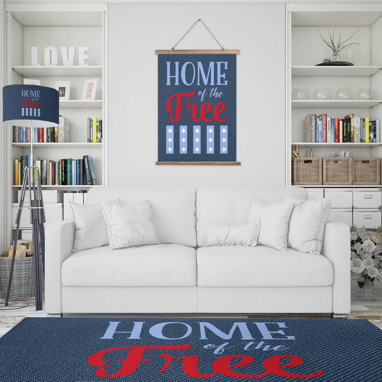 The background of this design is a dark blue denim, while the colors of the quote include a bright red, light blue, and white. The quote itself says "Home of the Free." On the coordinating design a red, white, and blue star is used with the the phrase "Land of the Brave" written underneath.