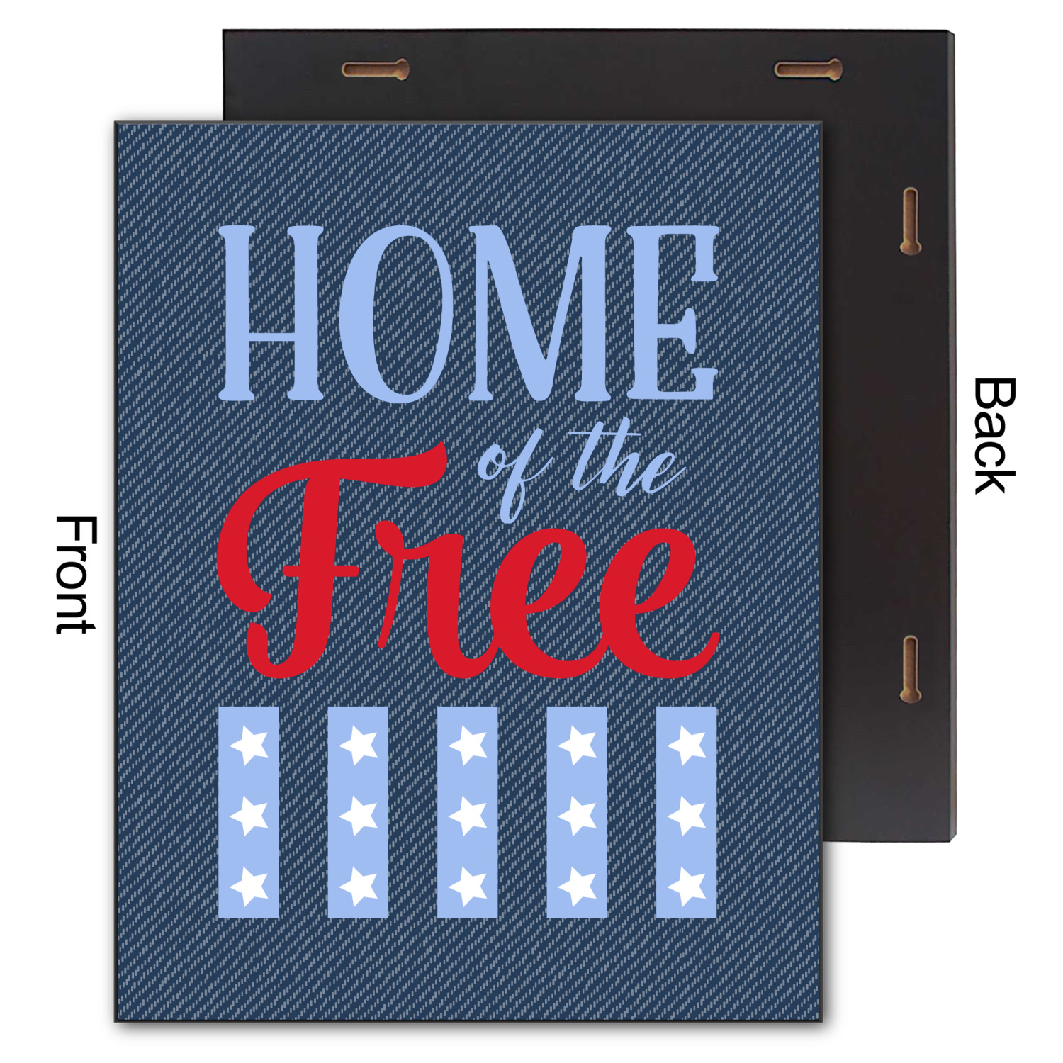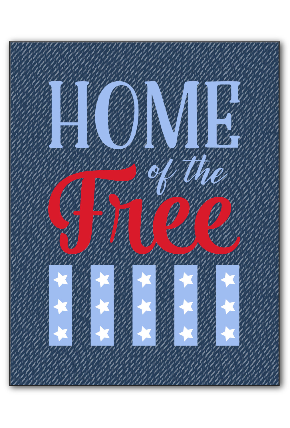 The background of this design is a dark blue denim, while the colors of the quote include a bright red, light blue, and white. The quote itself says "Home of the Free." On the coordinating design a red, white, and blue star is used with the the phrase "Land of the Brave" written underneath.