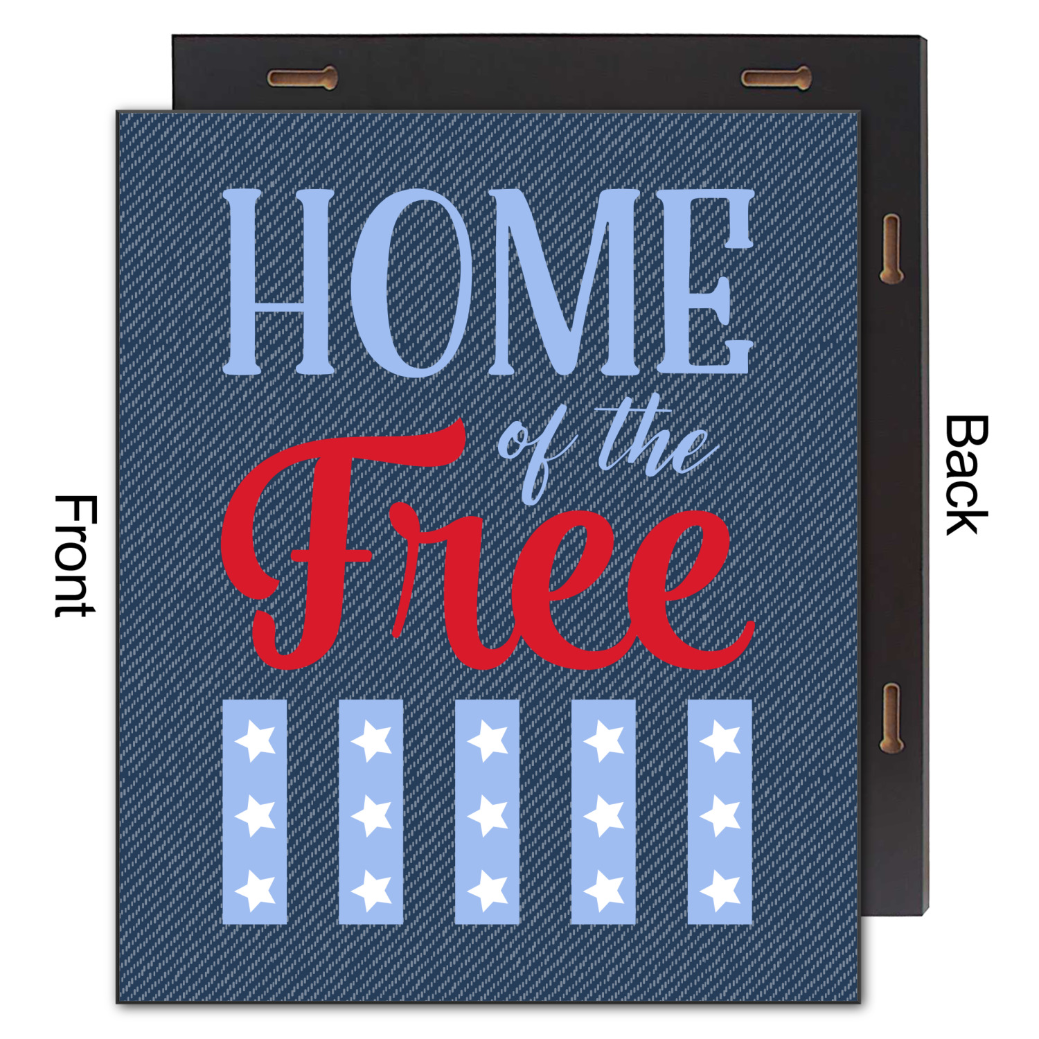 The background of this design is a dark blue denim, while the colors of the quote include a bright red, light blue, and white. The quote itself says "Home of the Free." On the coordinating design a red, white, and blue star is used with the the phrase "Land of the Brave" written underneath.