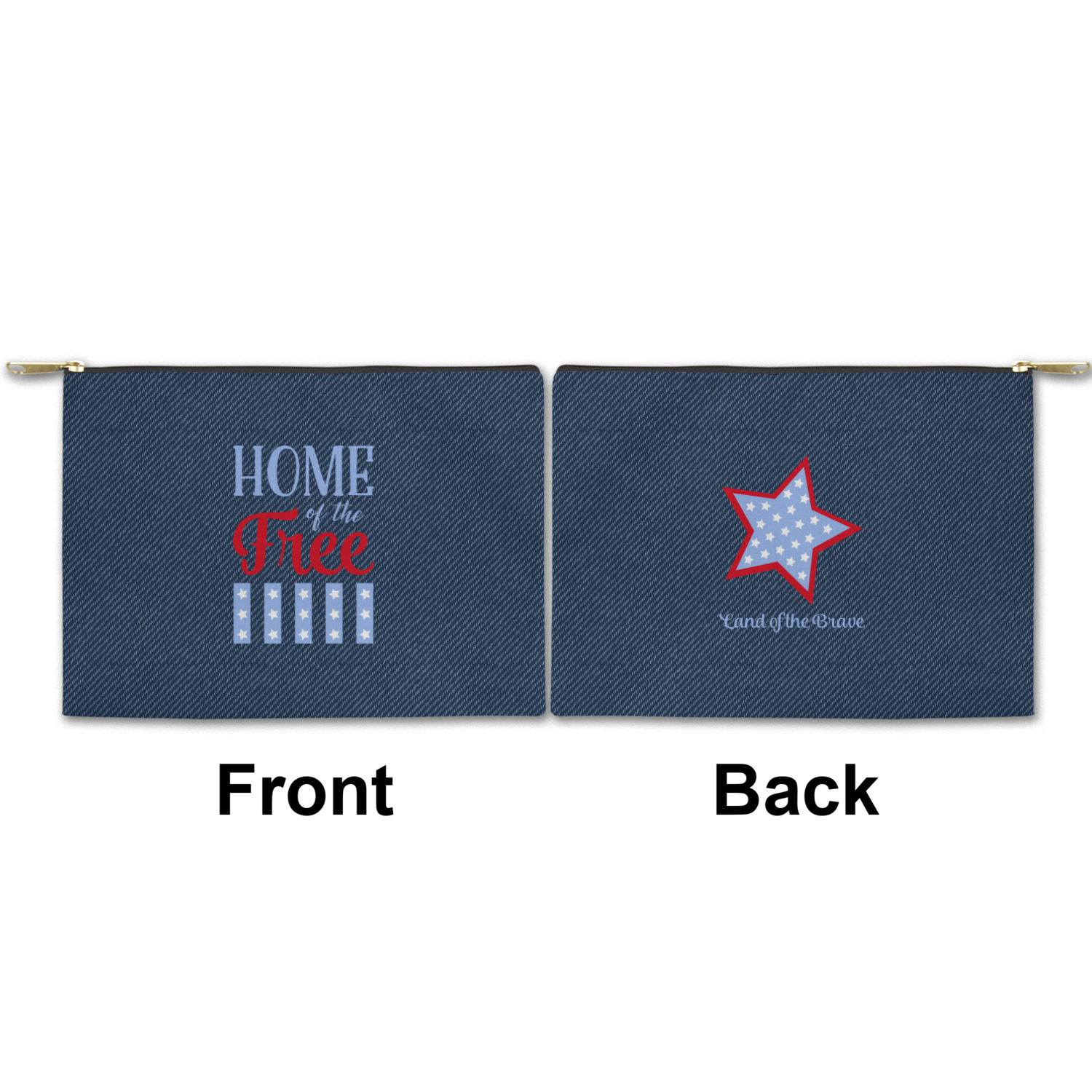 Our zippered pouches are available in two sizes - small: approx 8.5W"x6H and large: approx 12.5Wx8.5H. The pouches are made from a soft & durable canvas fabric that is printed on the outside with your design; the inside has a fused black lining. The printed canvas fabric is then cut and the pouches are sewn right here in the USA. The zipper itself is gold in color and has a round hook.