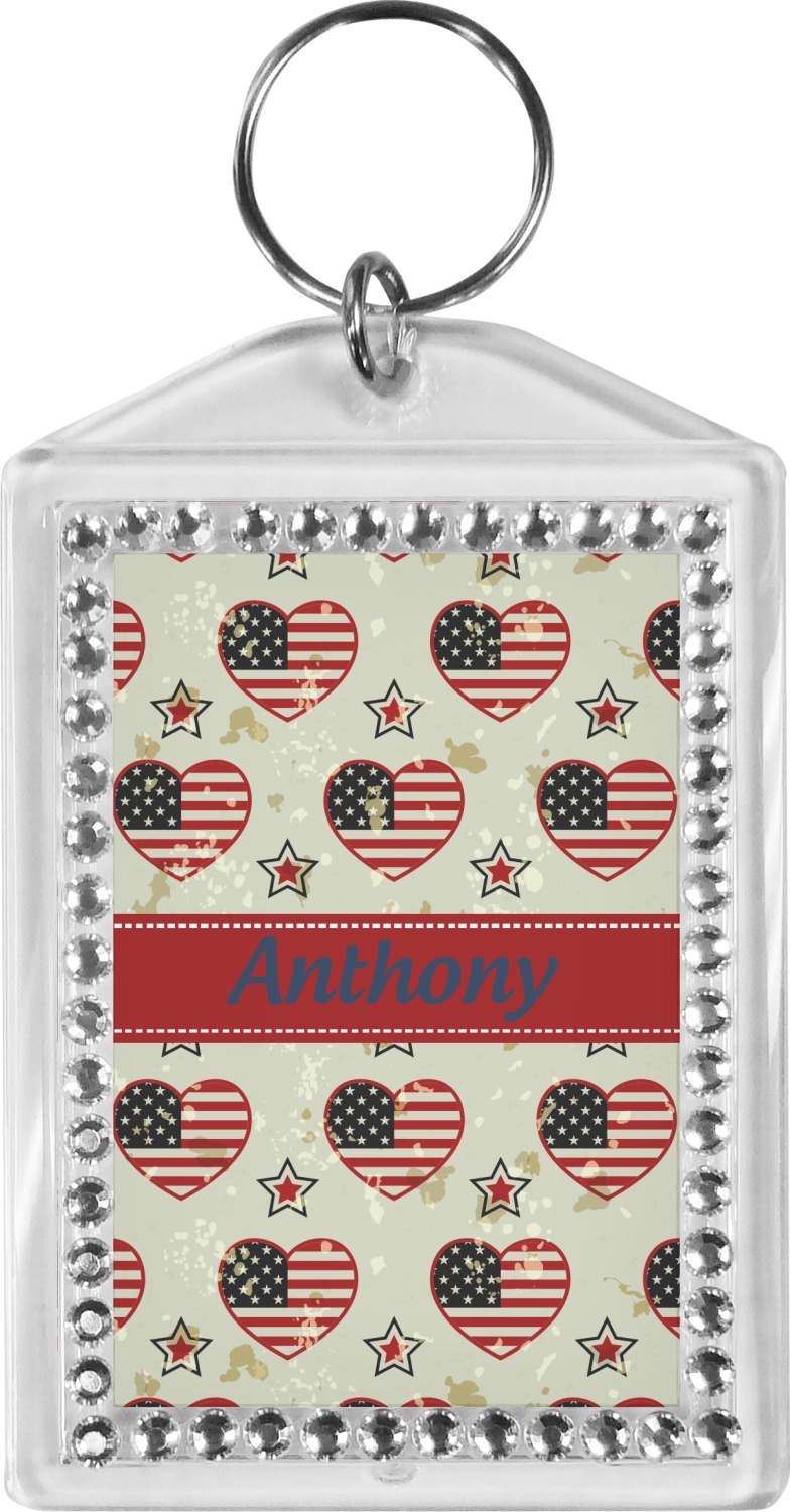 Our personalized keychains have a bold, rectangular shape, outlined by a series of shimmering rhinestones. A metal, split keyring is included with your purchase, and an additional metal hoop allows for attachment of the keychain to the split ring. This unique keychain measures at about 3.75 by 2.5 inches. We print your customized design(s) across both the back and front of this keychain.