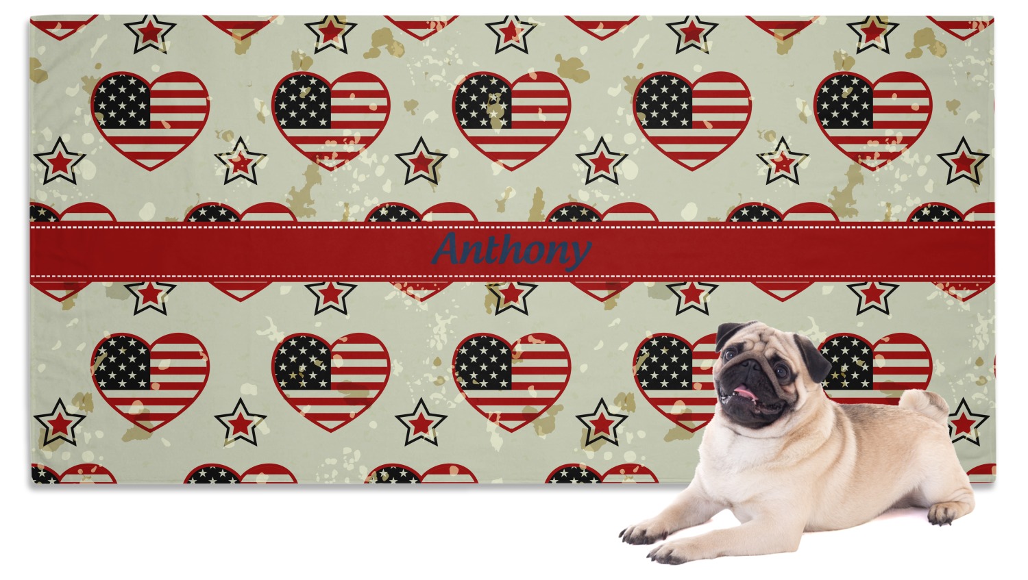 Our custom towels are crafted from a special blend of polyester and polyamide, which contributes to its lightweight, yet thoroughly absorbent nature. We craft it as such to guarantee efficiency as a convenient product; its lightweight nature makes it easy to roll up and carry along, yet it is still able to dry off even the wettest, muddiest pet. It measures at 60" x 30" and is sizable enough to dry off even the largest of pets. With our towel's gentle, soft-to-the-touch material, your pet will be sure to anticipate its warm, dry embrace. We print your personalized design on the front of the towel, while the back is white.