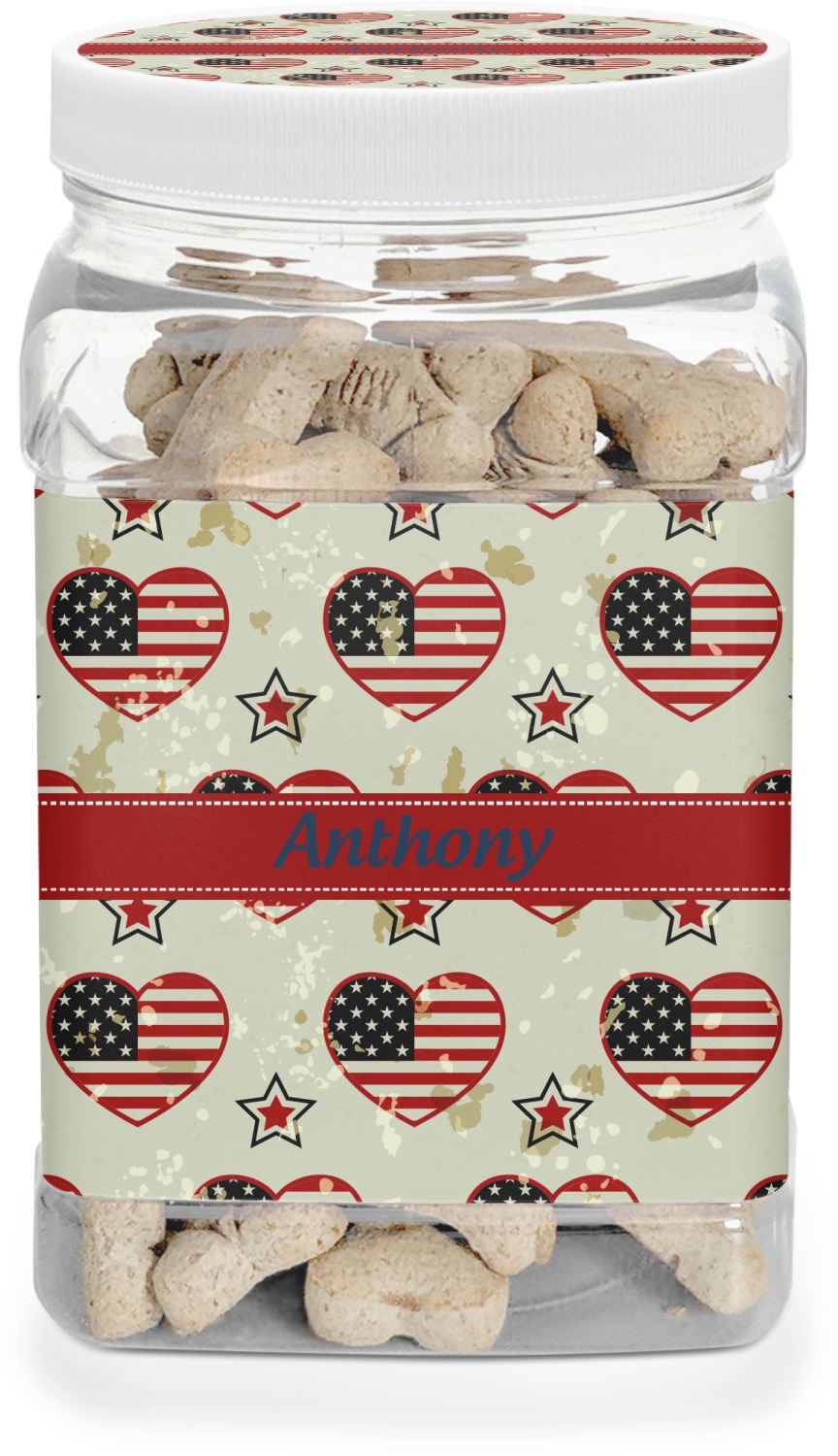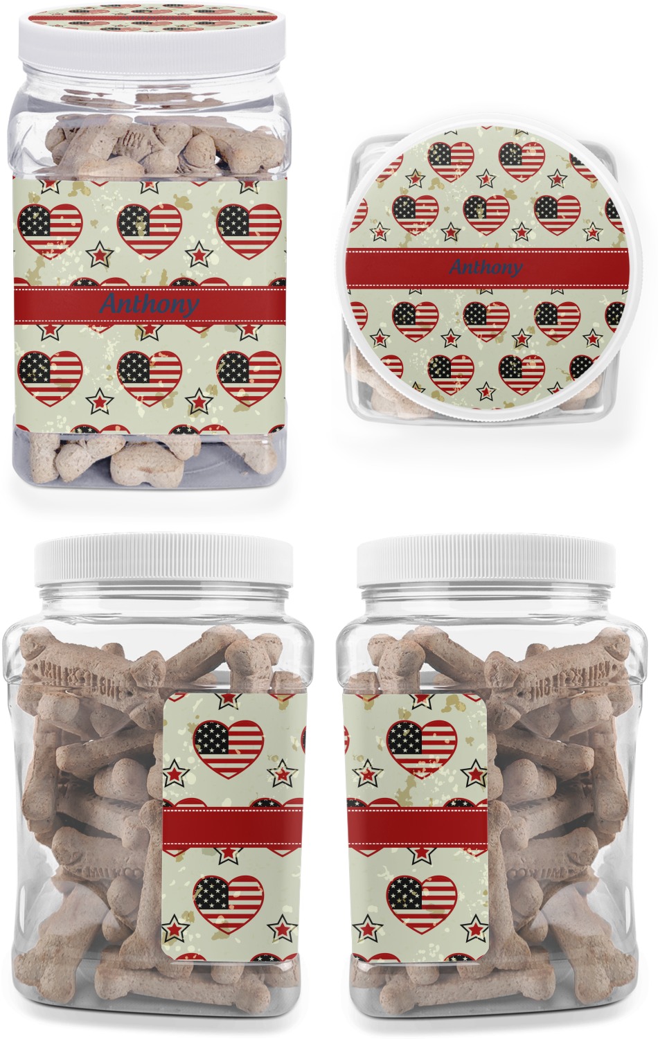 This half gallon jar, made from a sturdy plastic, is the perfect way to keep treats from any naughty pet paws, while still keeping them ready on hand for when your pup performs an impressive trick. This dog cookie jar features a screw-on, white lid that displays your personalized design on a vinyl sticker. We apply another customized sticker that wraps around the front and sides of the jar. Our dog treat jar also has indentations on the rear ends of the sides, which allows for convenient handling, and its square frame allows for easy storage.
