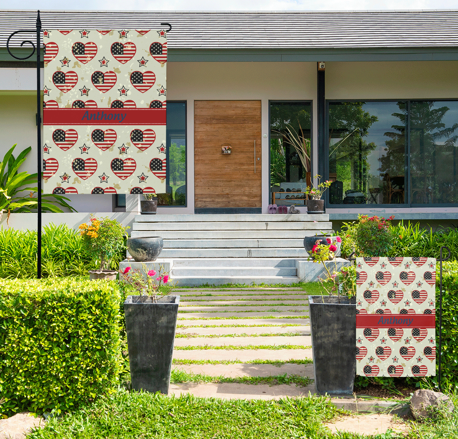 These custom garden flags are made of a durable, double-ply, polyester weave, allowing them to withstand the elements year round. The small flags measure at approximately 12 by 18 inches. The large flags measure out to 28 by 37 inches. You can order these decorative flags with your customization printed on the front only, or the front and back.