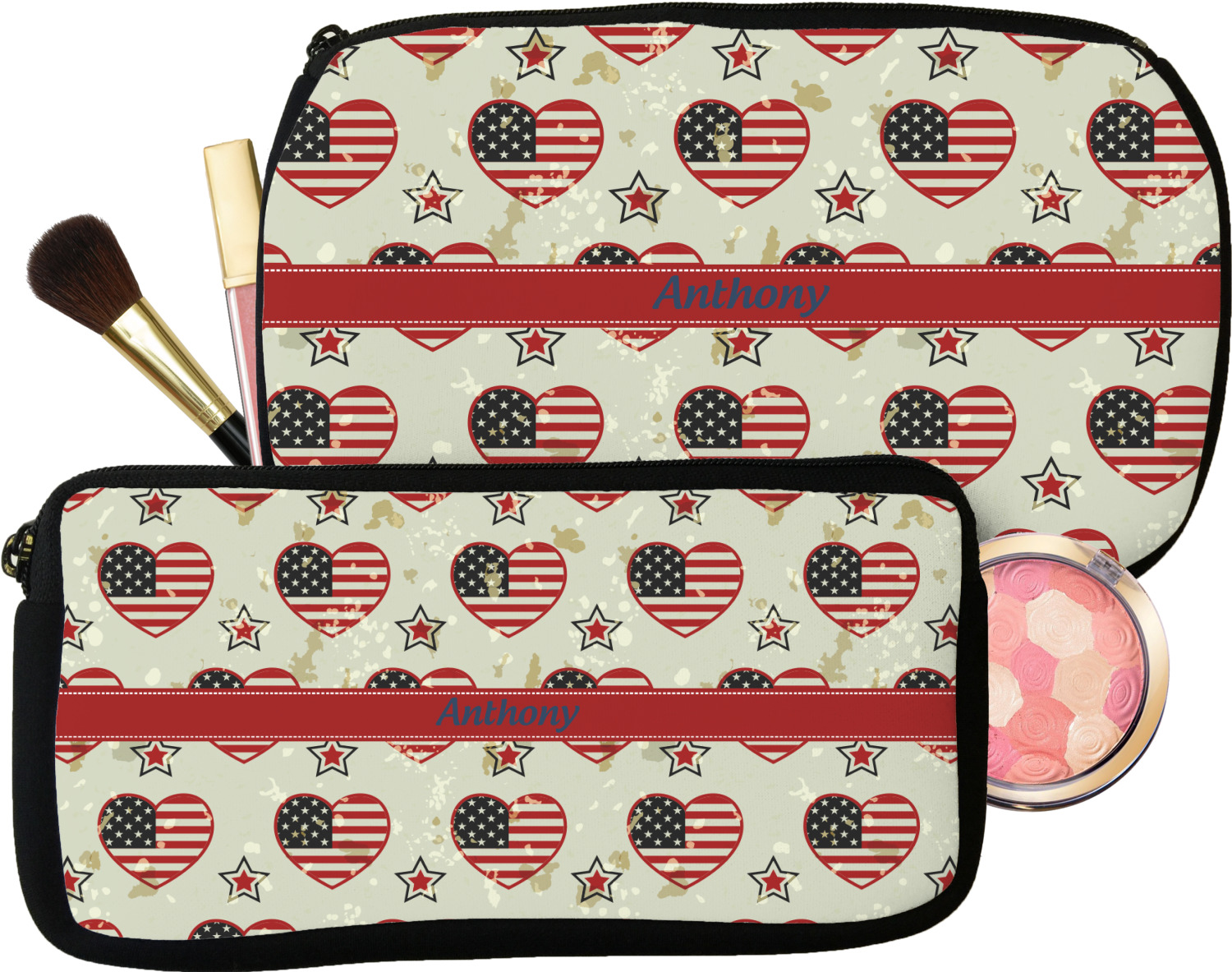 Our personalized makeup bags are available in many different designs, patterns and colors - so you are sure to find one that will love. They are made of neoprene (same material as wet-suits) and thus are water resistant, so spillages in your makeup bag will not end up all over you purse. They are customized on one side and are black on the other side and the zipper is black as well.