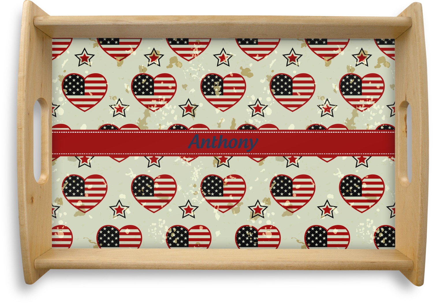 This serving tray with handles features square edges and two rounded sides, creating a very modern look. Each side is fabricated from a beautifully cut, natural wood. The bottom of the interior of the tray displays your customized design in bright, vibrant color. The tray is sold in both a black color and a natural wood look. Each variation of the wood serving tray has two sizes: Small, which is 14" x 10" x 2.25", and Large, which is 19.5" x 13.5" x 2.75".