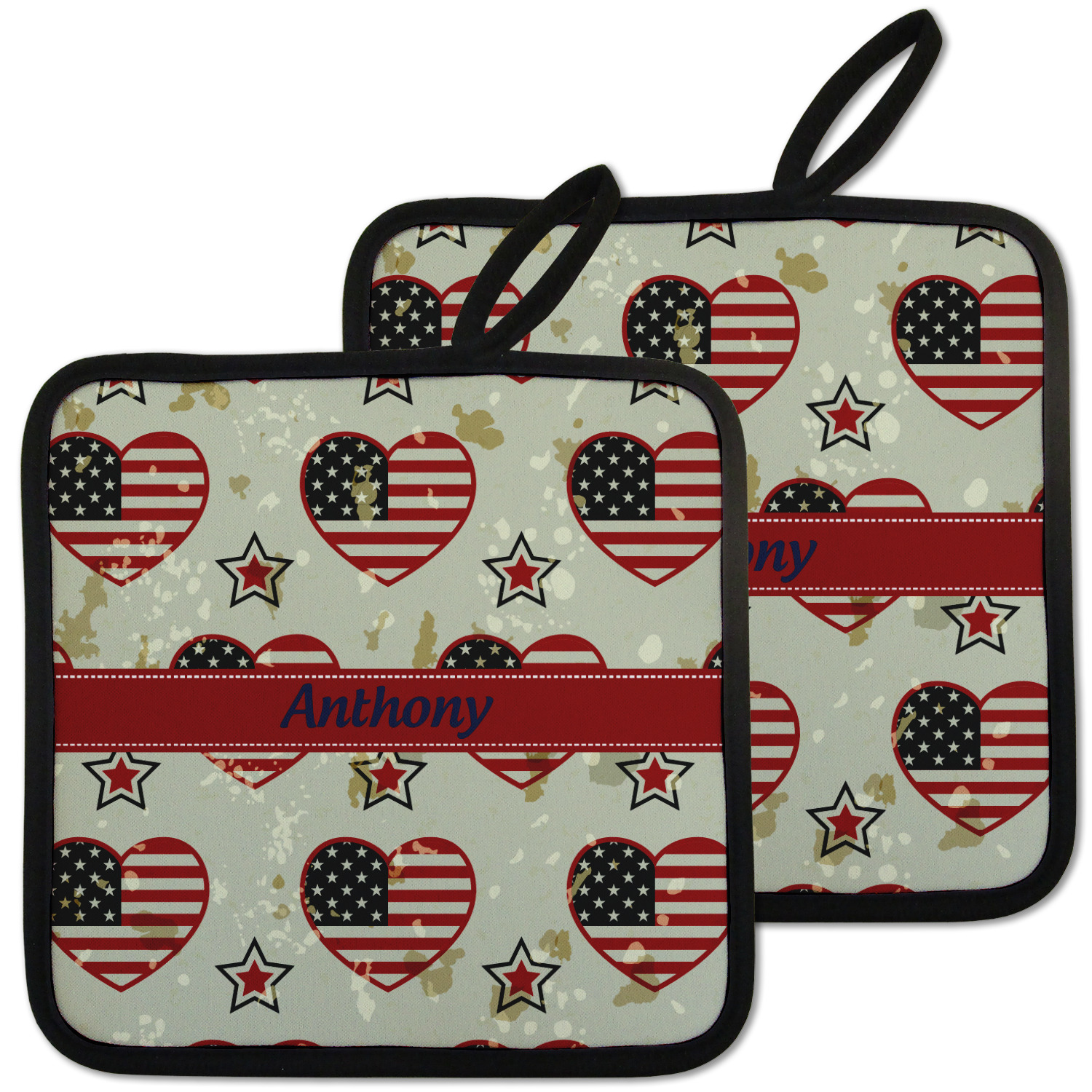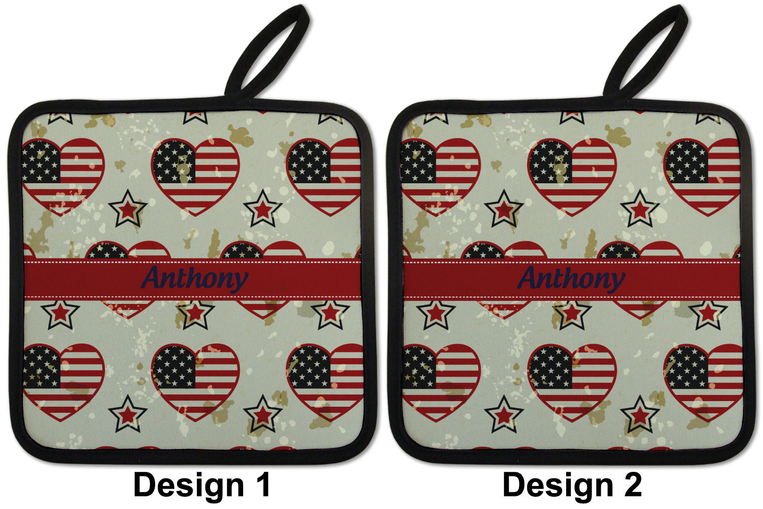 Our personalized pot holders feature a neoprene front that displays your personalization in vibrant colors. The backing of the hot pot holder is rubberized; the textured backing allows you to have a great grip when using this custom pot holder. The two materials are joined with a sleek, black trim, and the holder also includes an attached loop for hanging and storage. The pot holder is approximately 8.75 inches by 8.75 inches and 0.25 inches tall, while the fabric loop is 2.5 inches long. You can purchase a kitchen pot holder by itself or as a set of 2. We also offer a set including one pot holder and one oven mitt.